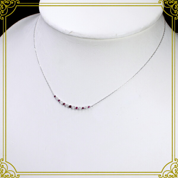 脇石:ルビー:Total約0.20ct ダイヤモンド:Total約0.12ct 寸法:約33.6x2.9x1.9mm チェーン長さ:約47cm(スライドアジャスター付) チェーン太さ:約0.8mm チェーン取り外し:不可 重さ:約2.5g |  |