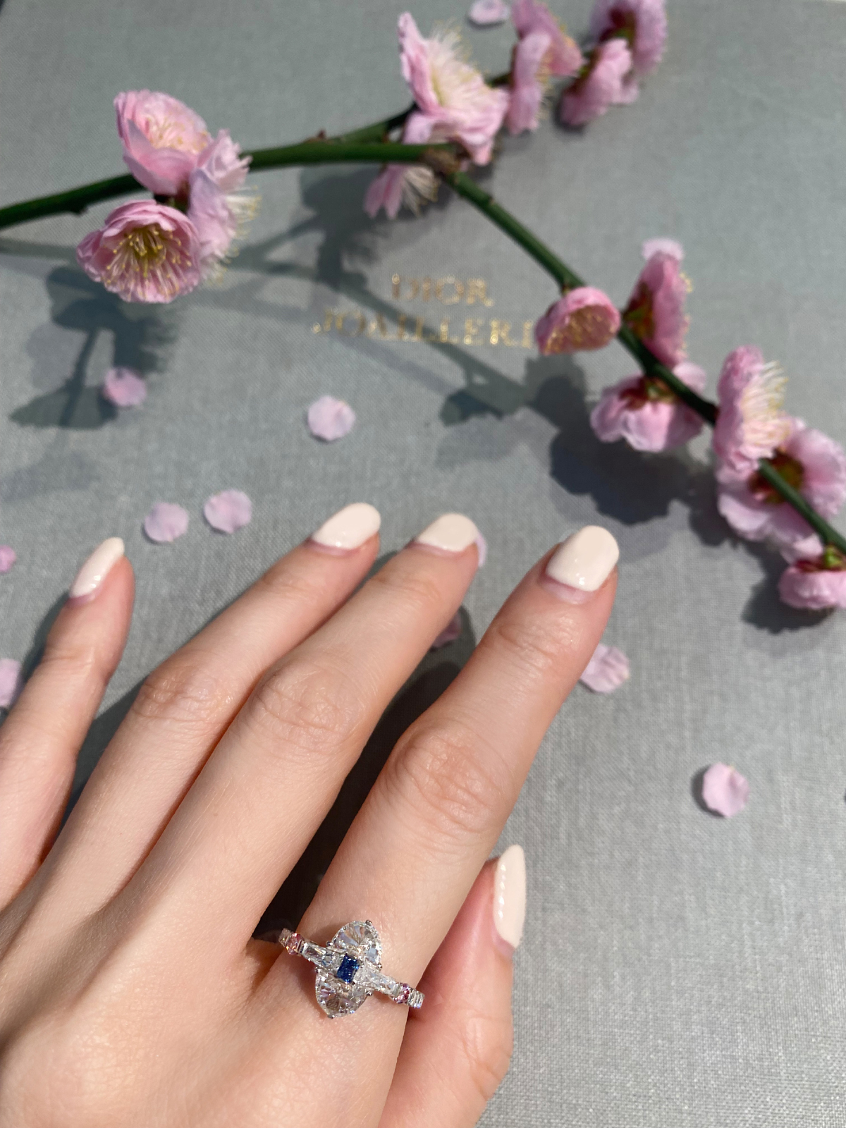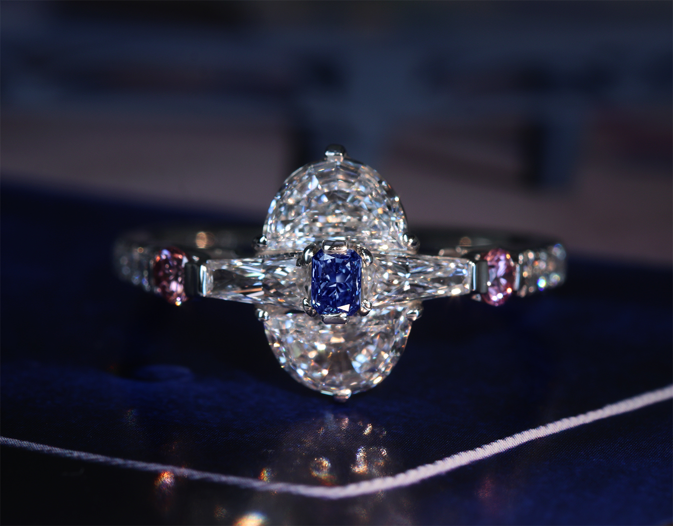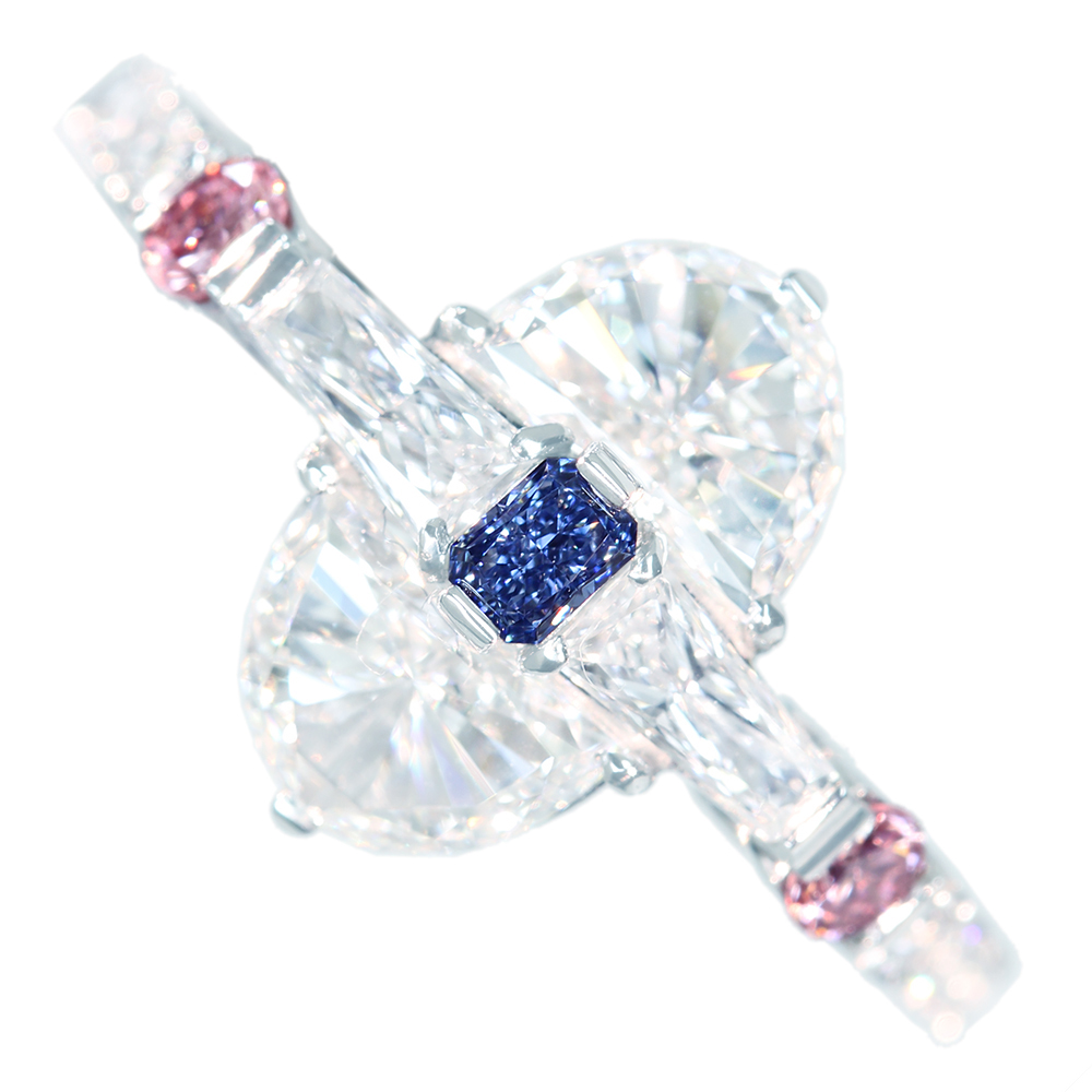 《100年引き継がれるジュエリーを- ハンドメイドジュエリー展》【HANDMADE】PT950 天然ブルーダイヤモンド FANCY VIVID BLUE VS-1 天然ピンクダイヤモンド FANCY INTENSE PINK ダイヤモンド 0.40ct E VVS1 / 0.041ct F VS1 ハーフムーン ダイヤモンド 0.902ct リング [AGT/中央宝石研究所/GIA]