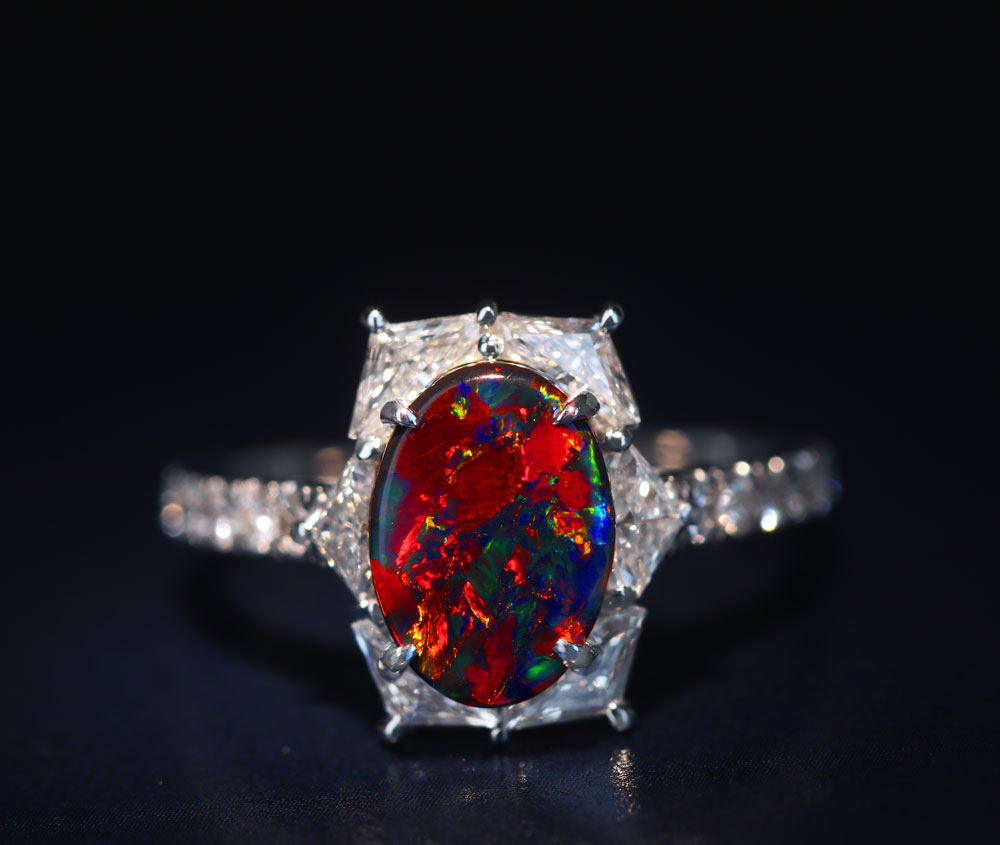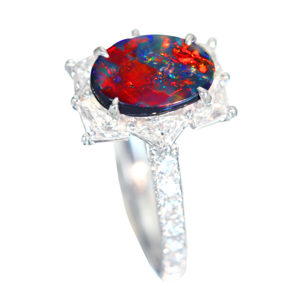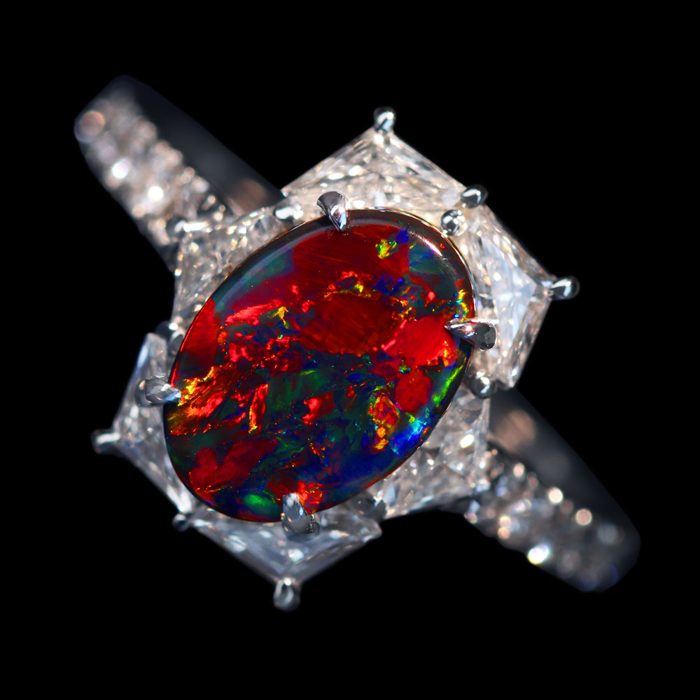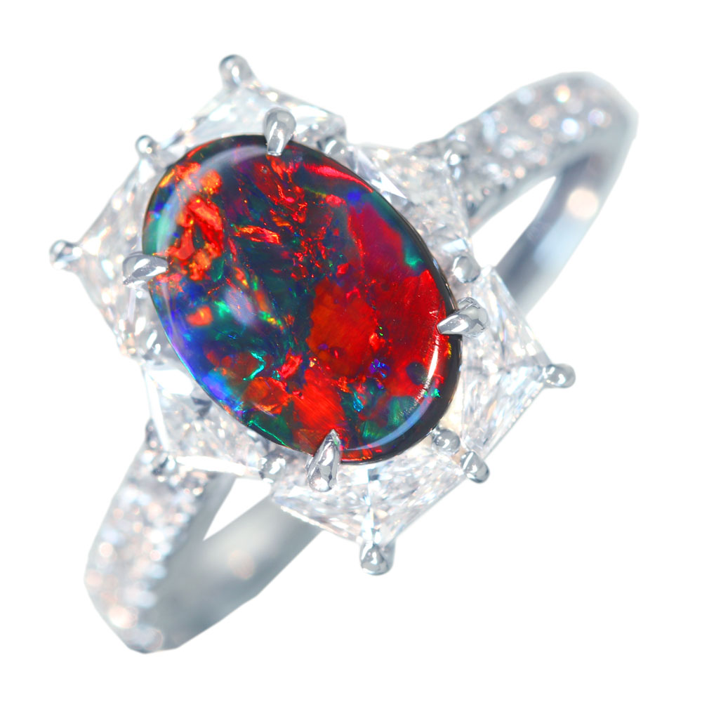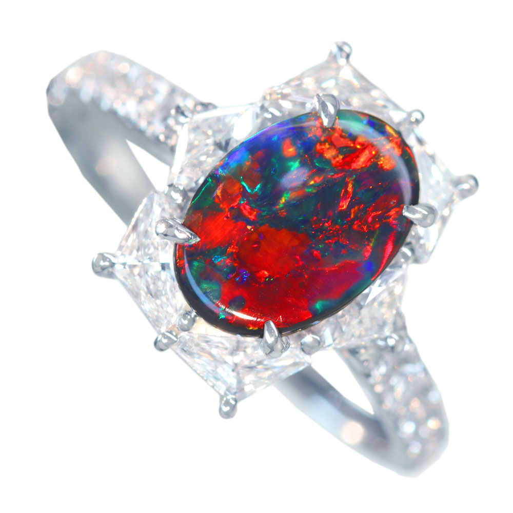 《100年引き継がれるジュエリーを- ハンドメイドジュエリー展》見事な赤腑!【HANDMADE】PT950 ブラックオパール 1.01ct ダイヤモンド 0.96ct リング