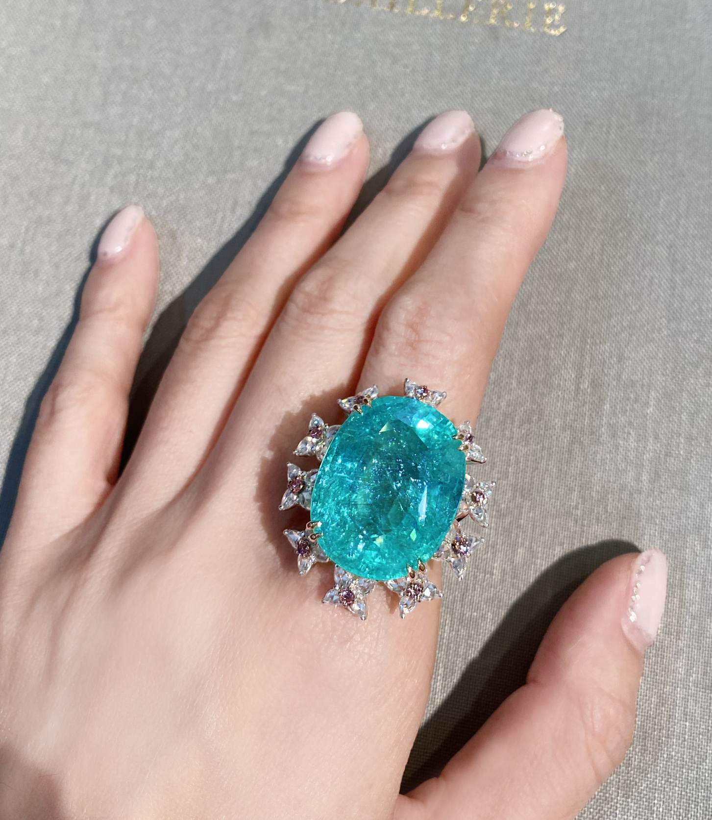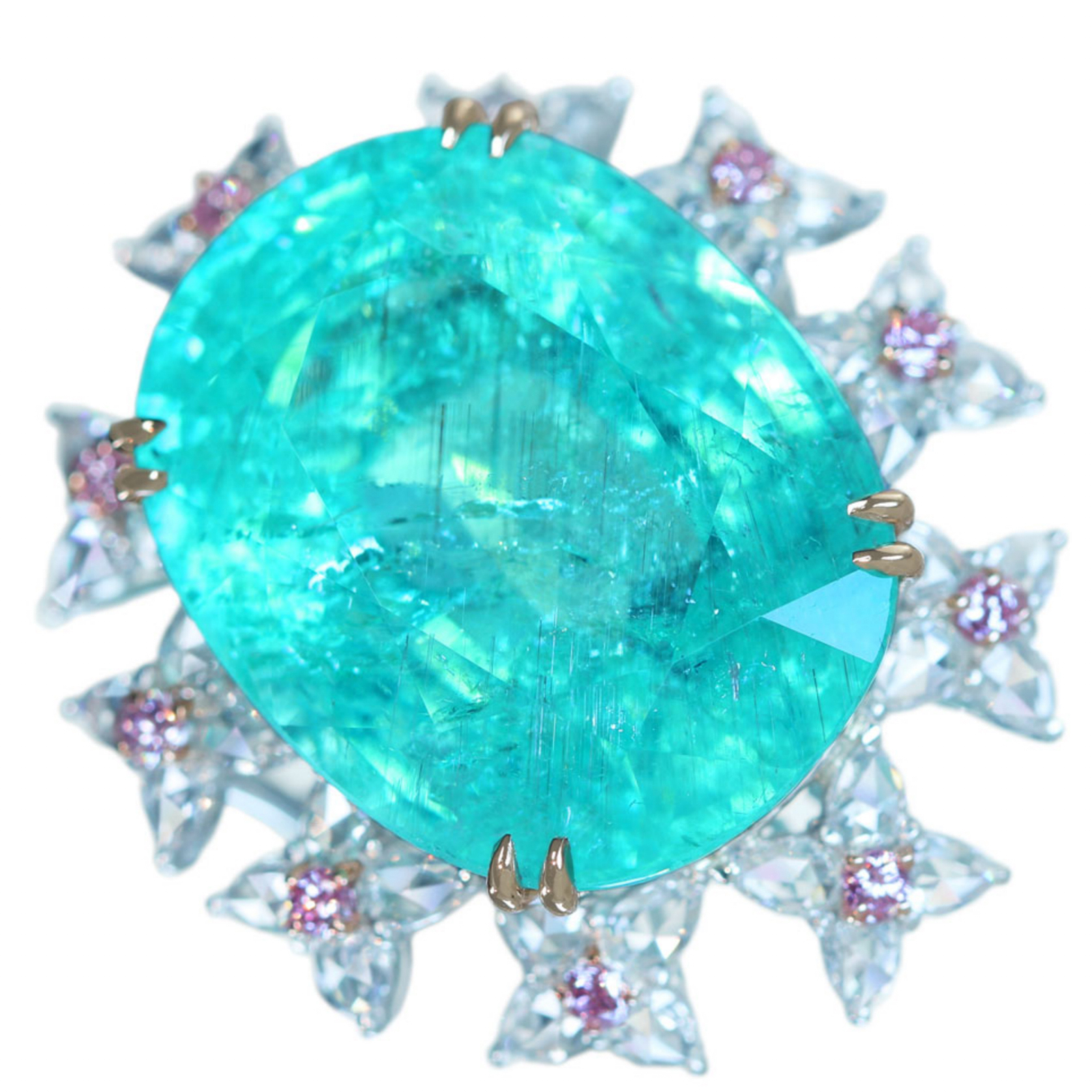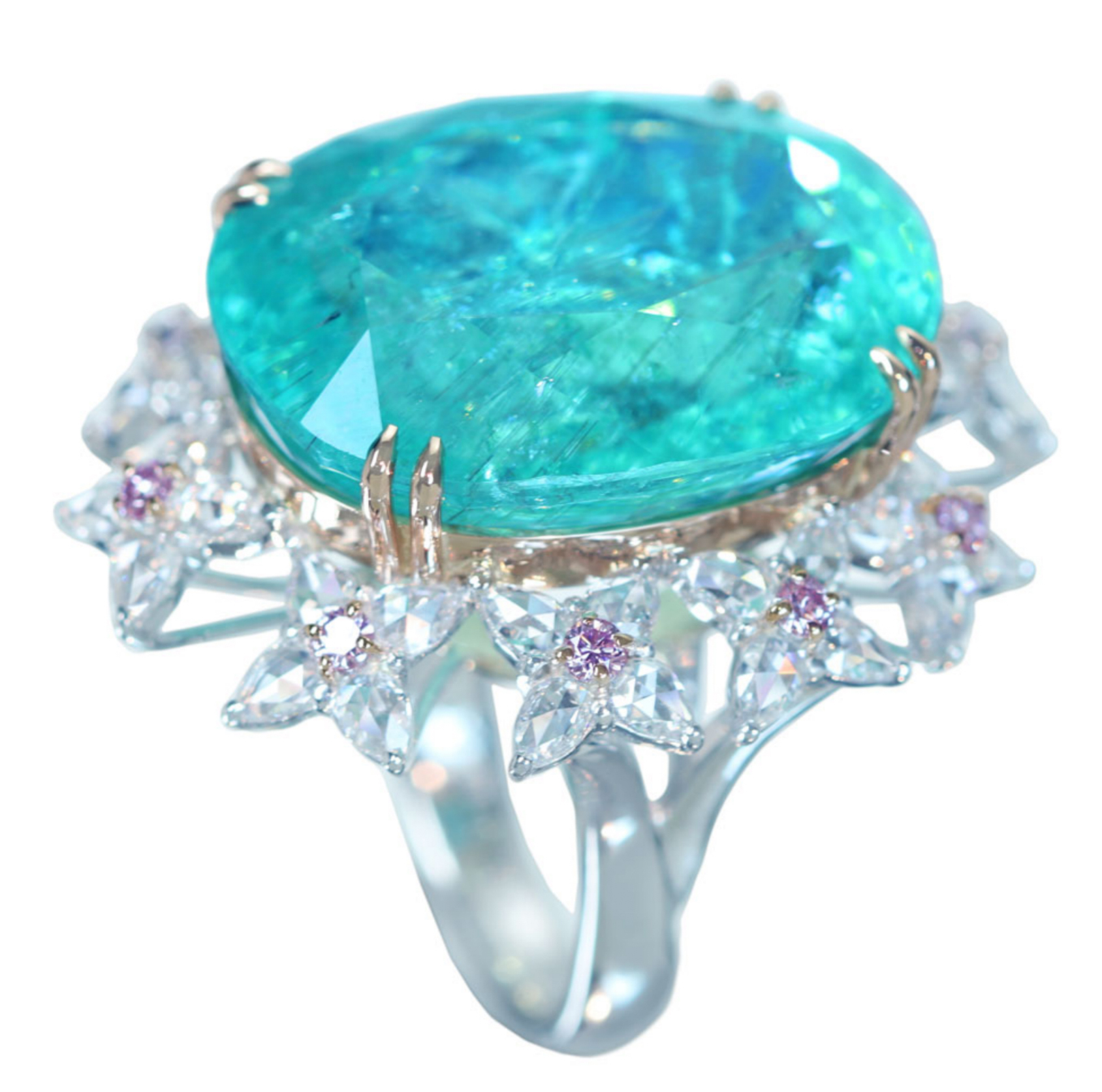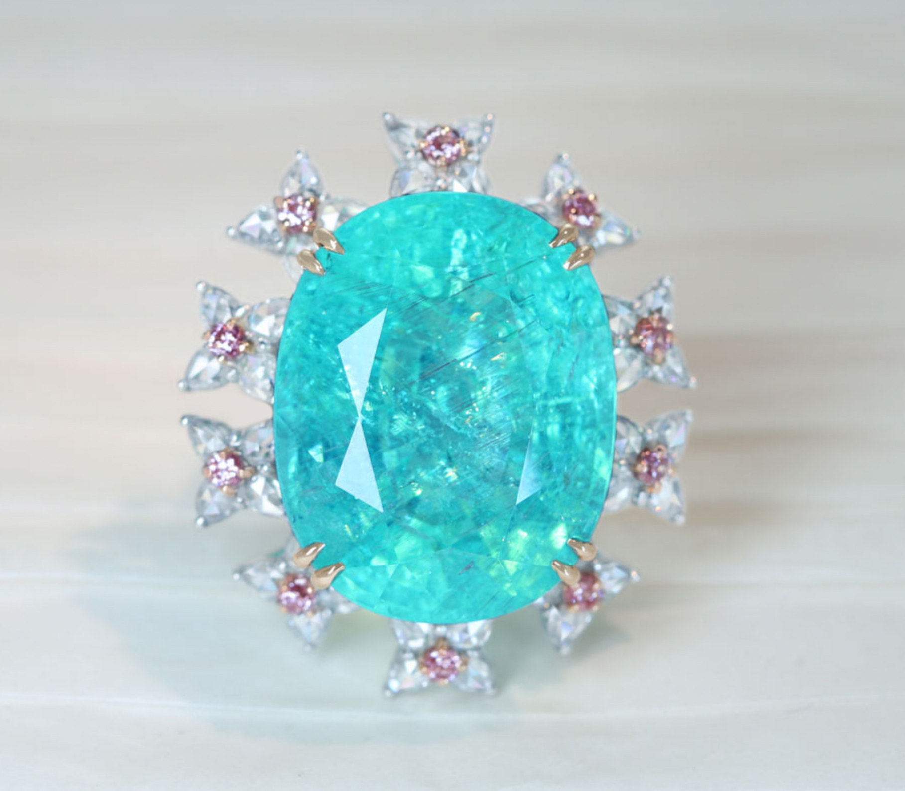 《100年引き継がれるジュエリーを- ハンドメイドジュエリー展》【HANDMADE】Pt950/K18 パライバトルマリン 34.950ct ピンクダイヤモンメレ 0.34ct ローズカットダイヤモンド 1.827ct リング