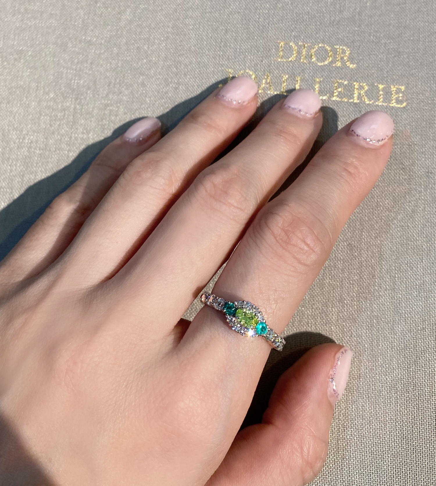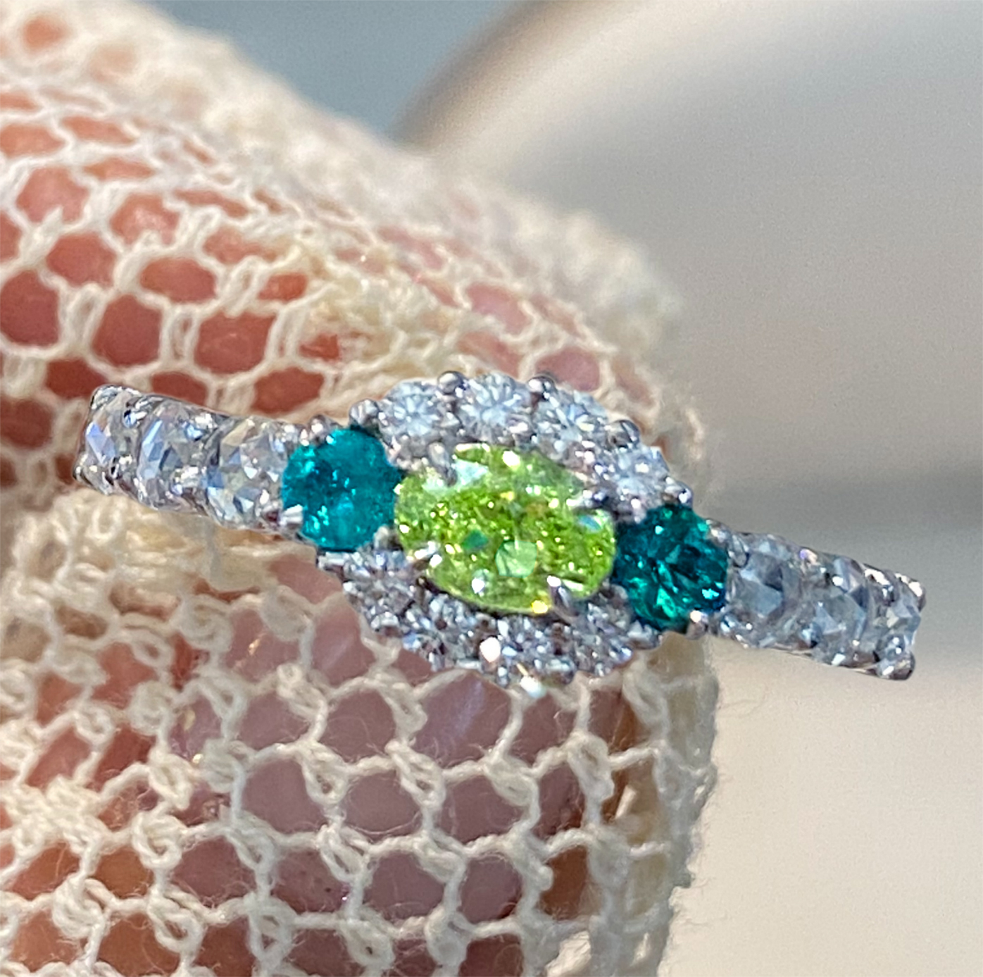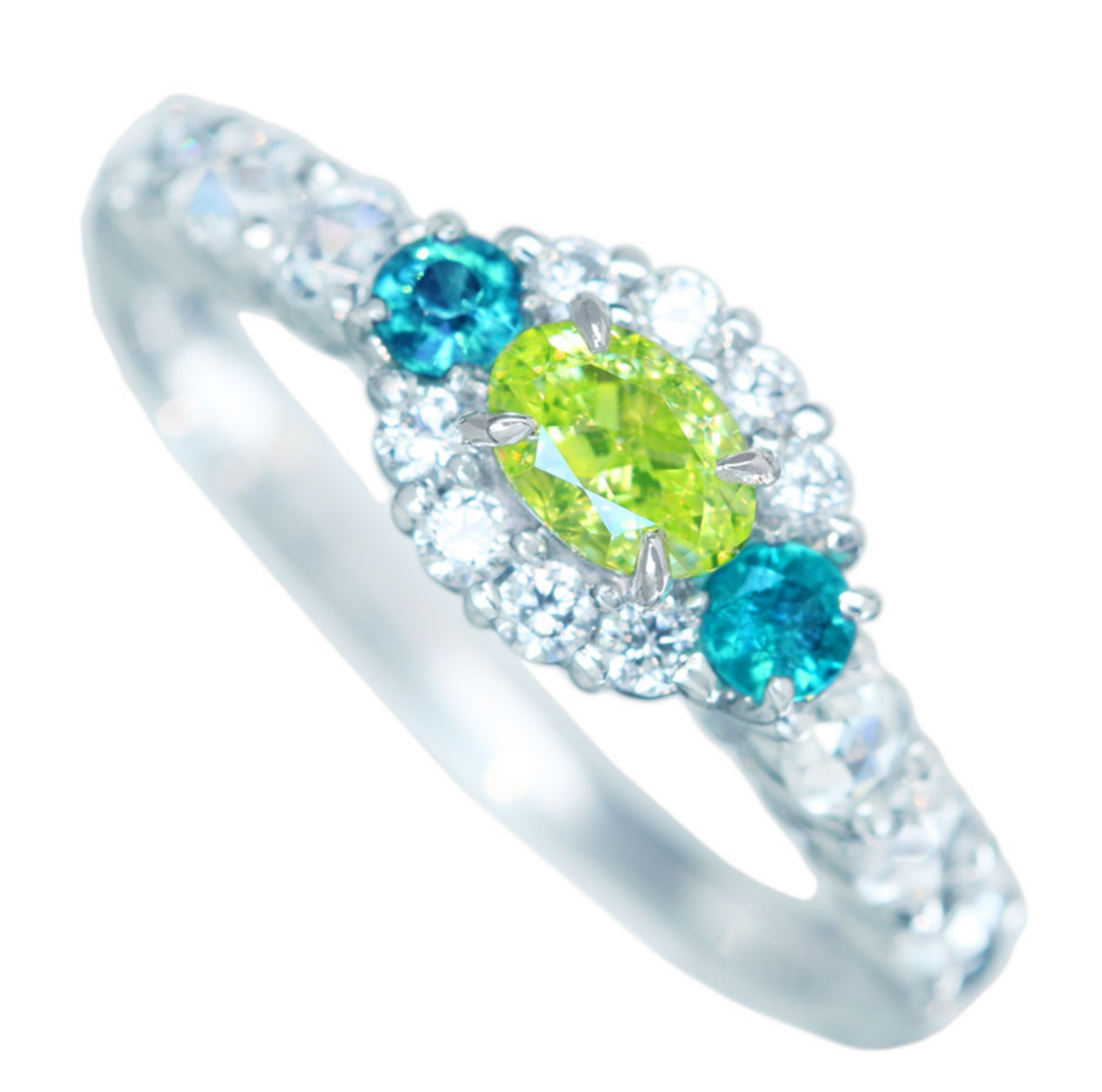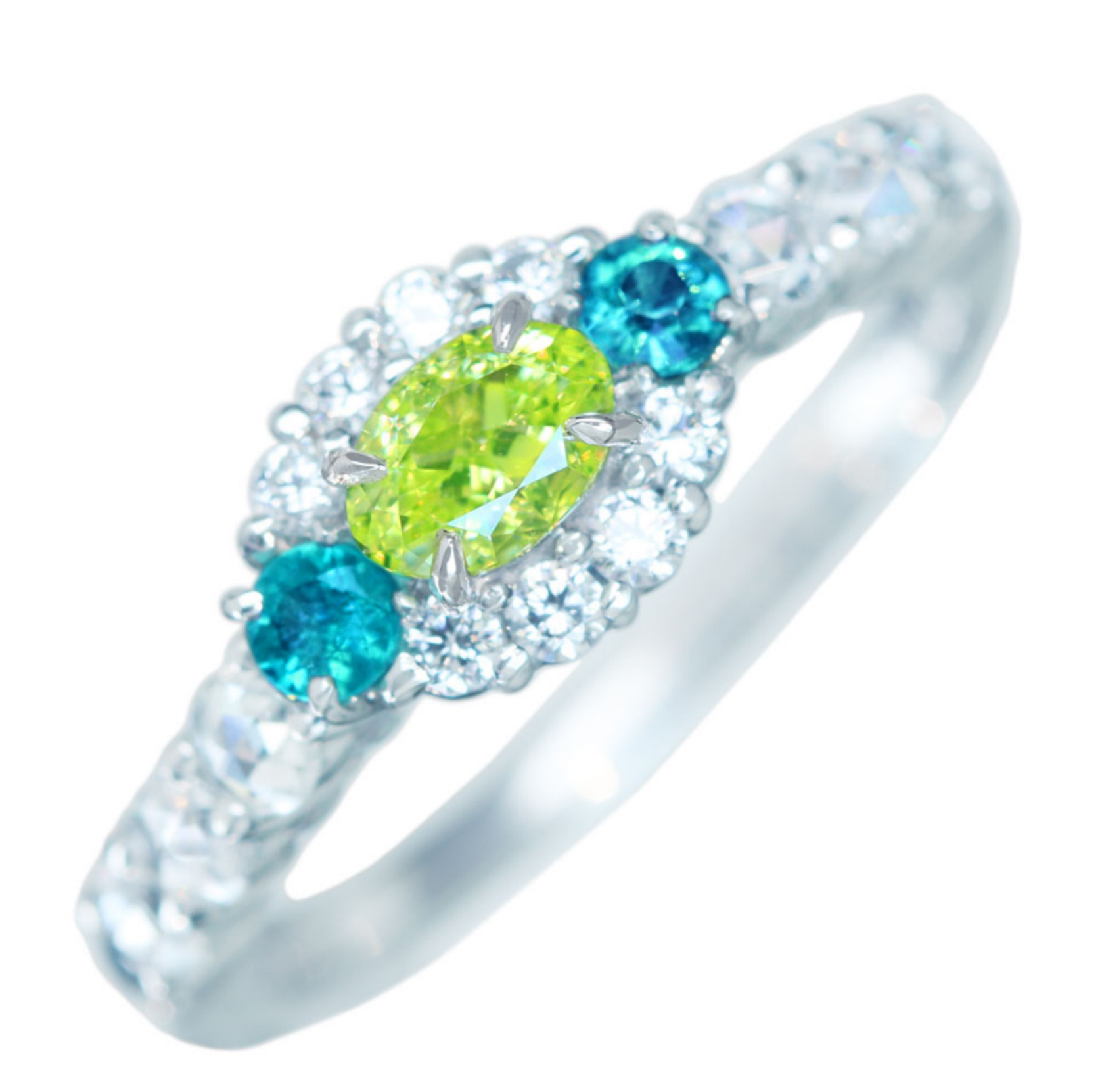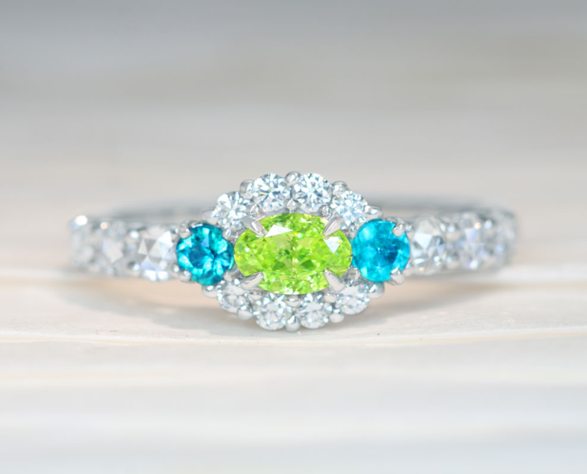 《100年引き継がれるジュエリーを- ハンドメイドジュエリー展》限定価格!【HANDMADE】PT950 グリーンイエローダイヤモンド FANCY INTENSE GREEN YELLOW GIA VS1 0.30ct ブラジル産パライバトルマリン ローズカット ダイヤモンド リング[GIA]