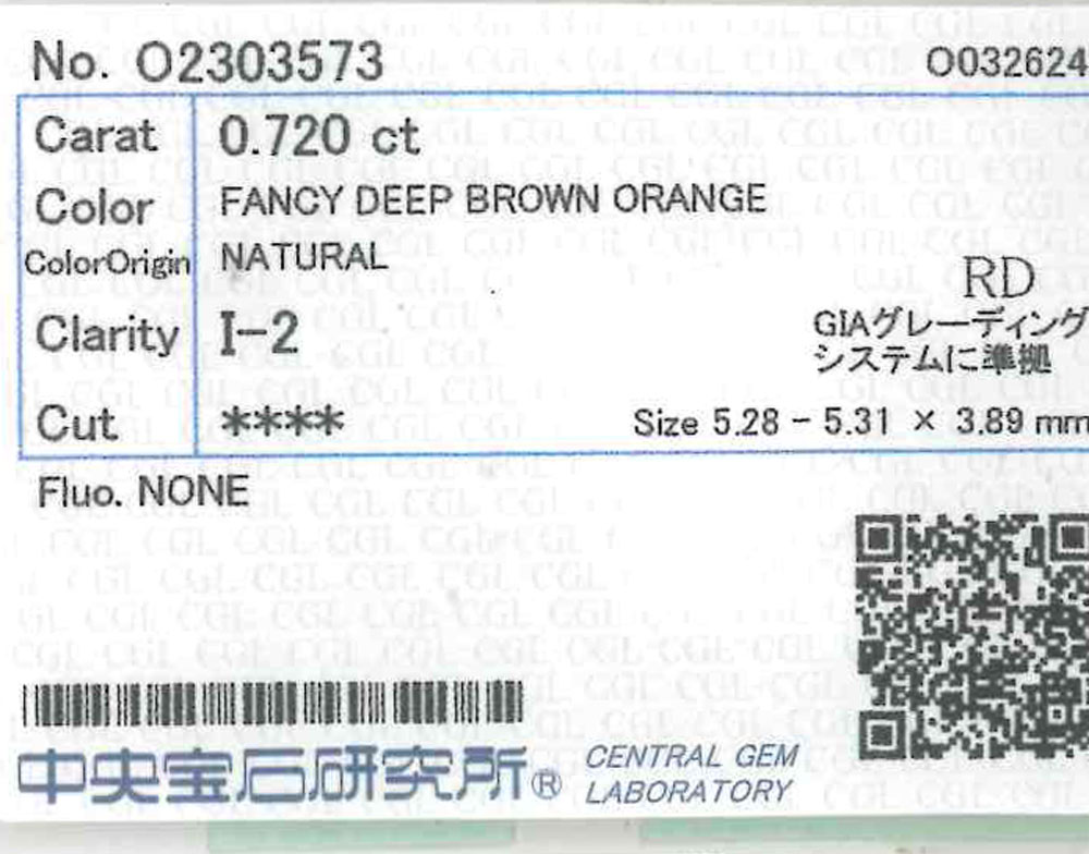 オレンジダイヤモンド 0.720ct FANCY DEEP BROWN ORANGE ルース[中央宝石研究所]