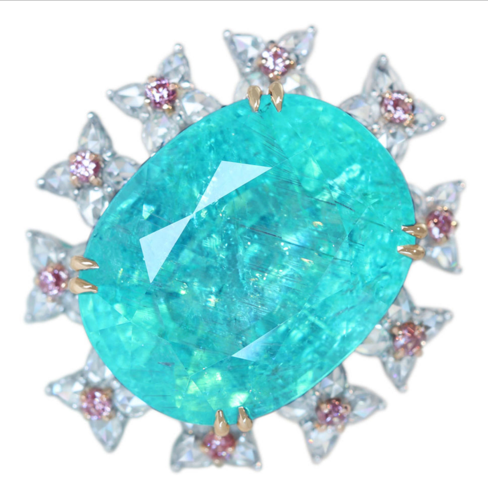 《100年引き継がれるジュエリーを- ハンドメイドジュエリー展》【HANDMADE】Pt950/K18 パライバトルマリン 34.950ct ピンクダイヤモンメレ 0.34ct ローズカットダイヤモンド 1.827ct リング