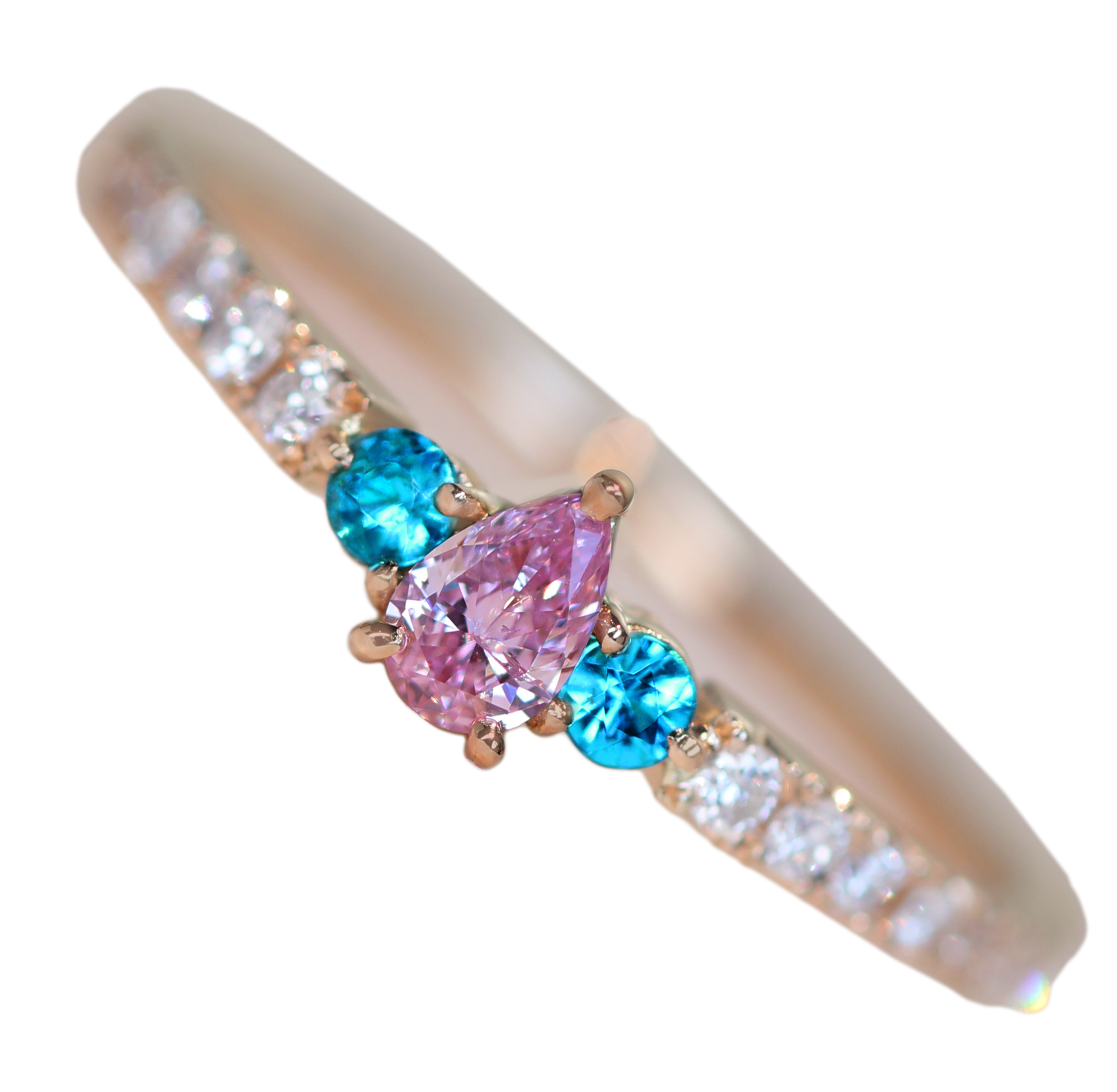 【HANDMADE】新作特別価格!K18PG ピンクダイヤモンド 0.12ct FANCY PURPLISH PINK SI2 ブラジル産パライバトルマリン 0.067ct ダイヤモンド 0.12ct リング ペアシェイプ[中央宝石研究所]