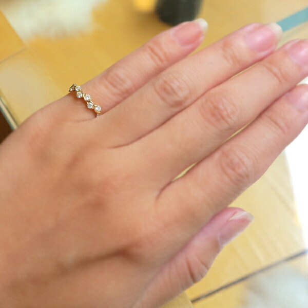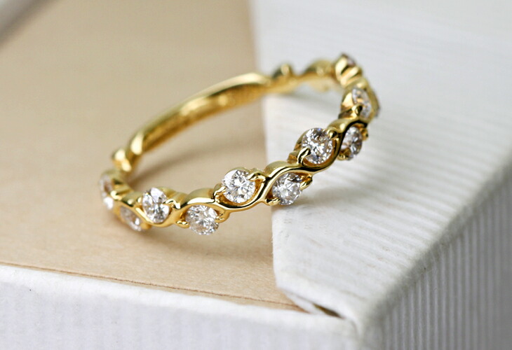 ただ一列に並ぶエタニティタイプよりも輝きに量感があり、それでもさりげない輝きの量感…なんとも憎い心地よさを感じさせるリングです。