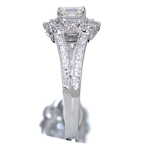 取り巻きのダイヤは美しいプロポーションで眩い輝きを放つ大粒ピース。 ギラギラとしたきらめき、メインストーンを一回り大きく感じさせます。