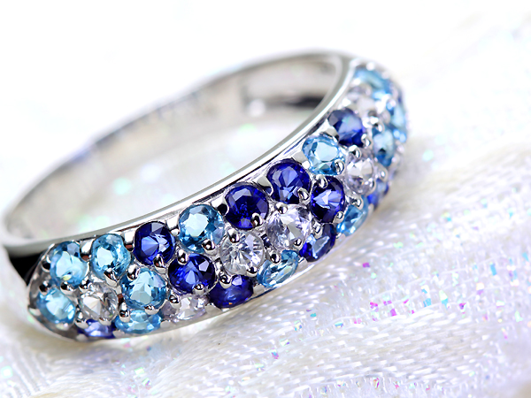 材質…K10ホワイトゴールド 重量…約2.4g リングサイズ…7~16番よりお選び下さい 最大幅…約5.9mm 厚み…約3mm 脇石…ブルーサファイア、ホワイトサファイア、ブルートパーズトータル約1.3ct