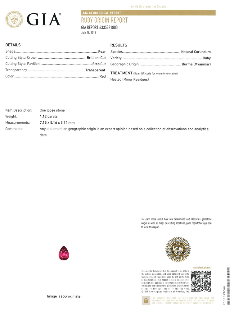 【HANDMADE】PT950 ビルマ産 ルビー 1.12ct ペアシェイプ ダイヤモンド total 0.651ct ファンシーシェイプ ペンダントトップ【GIA】