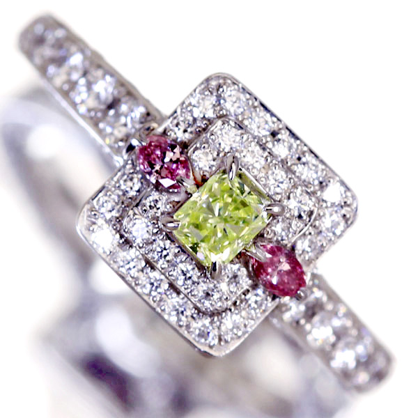 【HANDMADE】PT950 グリーンダイヤモンド ピンクダイヤモンド リング FANCY YELLOW GREEN VS2 0.192ct 0.070ct 0.805ct ダイヤモンド[CGL]