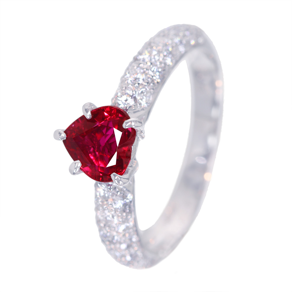 ルビーがやや上に持ち上げられ、ルビーの美しさがパビリオンサイドからも零れ落ちる様子が感じられる、