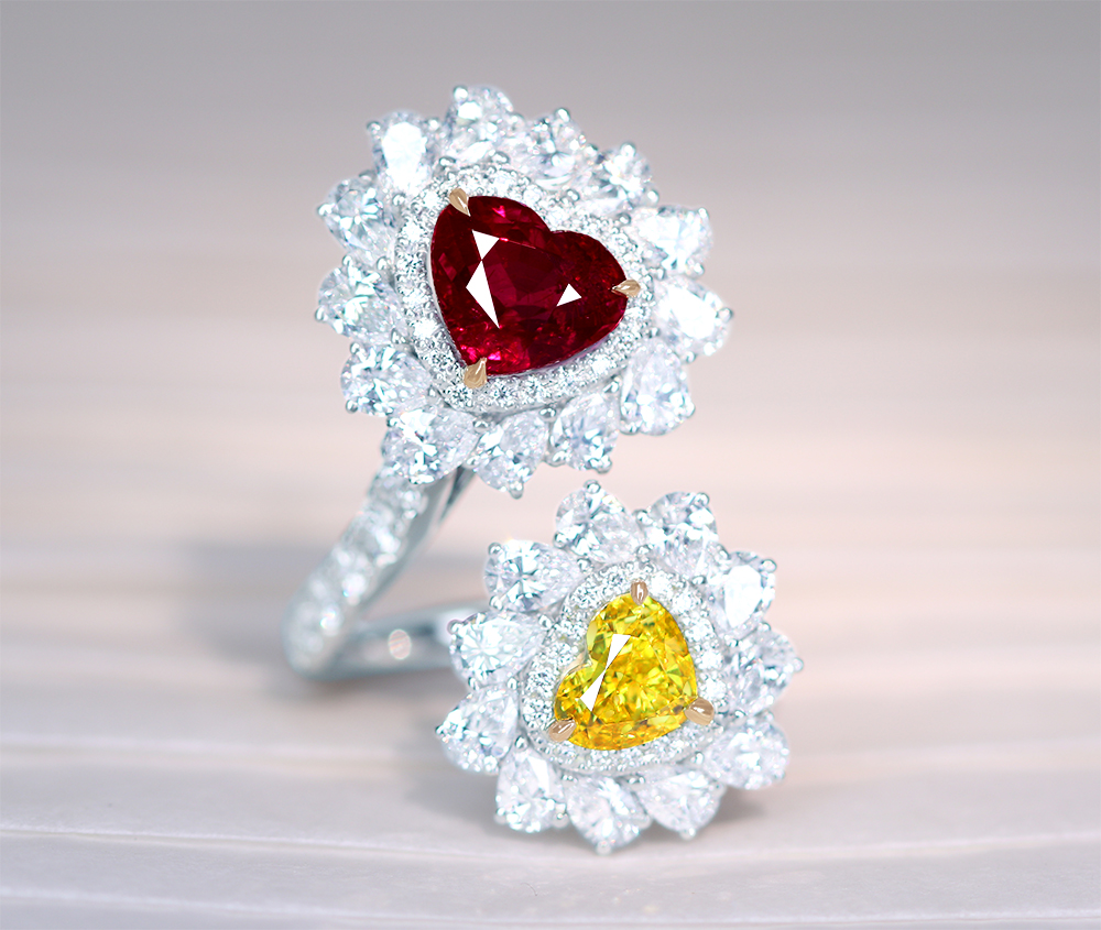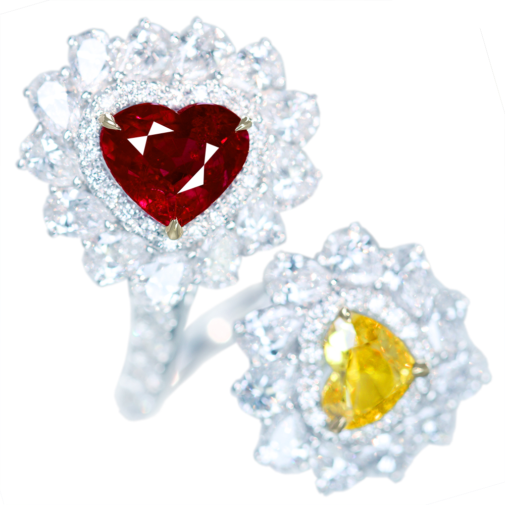 - Jewel planet superb Handmade - 《100年引き継がれるジュエリーを- ハンドメイドジュエリー展》【HANDMADE】PT950/K18 非加熱ルビー 2.07ct ハートシェイプ イエローダイヤモンド FANCY VIVID YELLOW VS1 0.76ct ハートシェイプ カラーレスダイヤモンド 3.267ct リング [GIA]