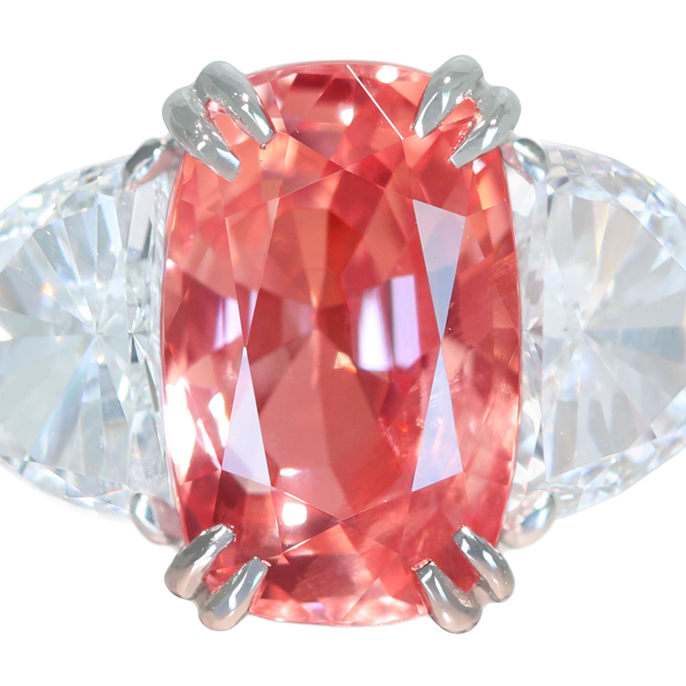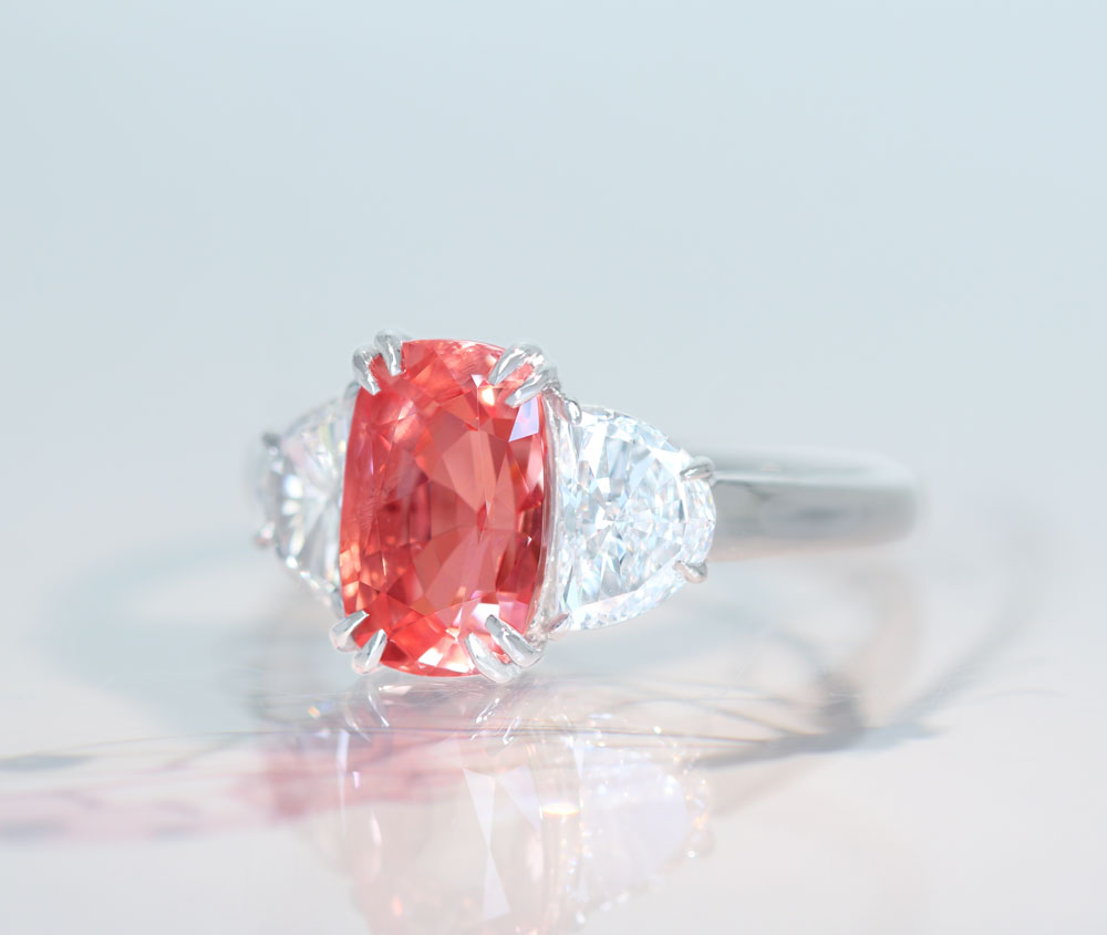 《100年引き継がれるジュエリーを- ハンドメイドジュエリー展》【HANDMADE】PT950 スリランカ産 非加熱パパラチャサファイア 2.54ct ハーフムーンダイヤモンド 0.40ct E VVS1/0.41ct F VS1 リング[GIA]