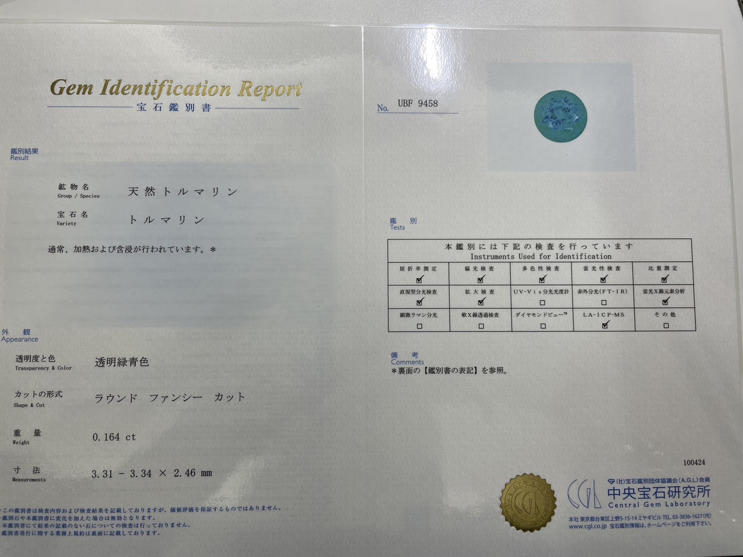 【含有量4.32%!】【代行販売】ブラジル産パライバトルマリン 0.164ct ルース ラウンド[中央宝石研究所]