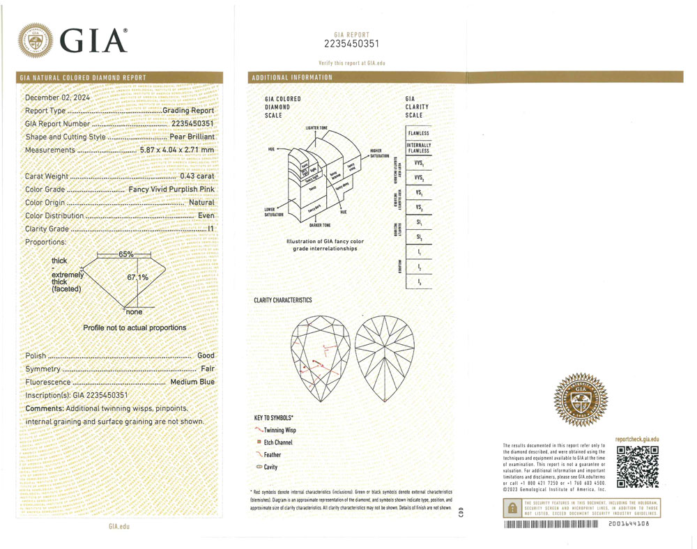 TOP QUALITYピンクダイヤモンド 0.43ct FANCY VIVID PURPLISH PINK I1 ルース ペアシェイプ[GIA]