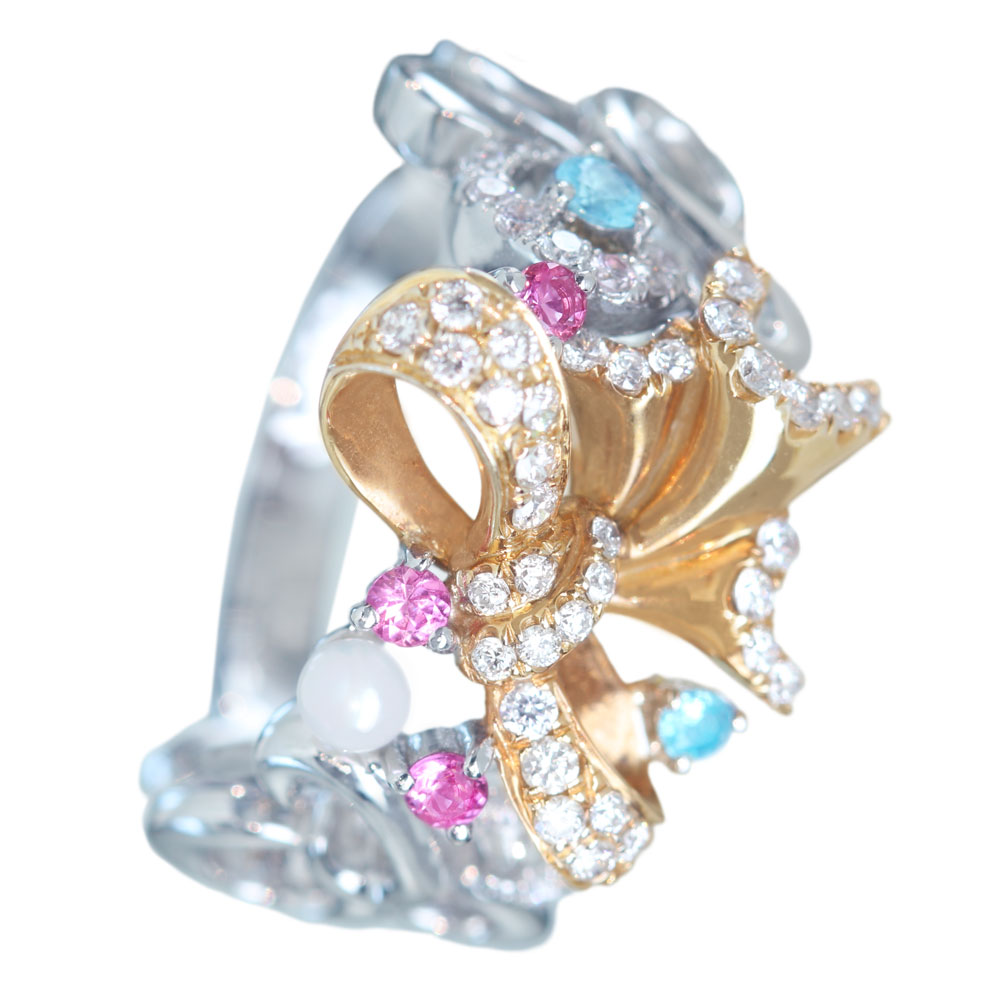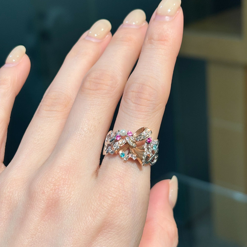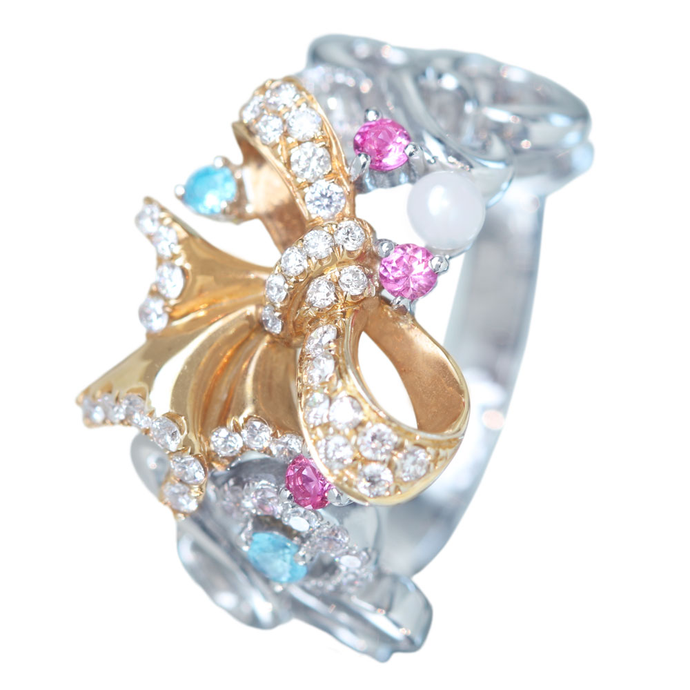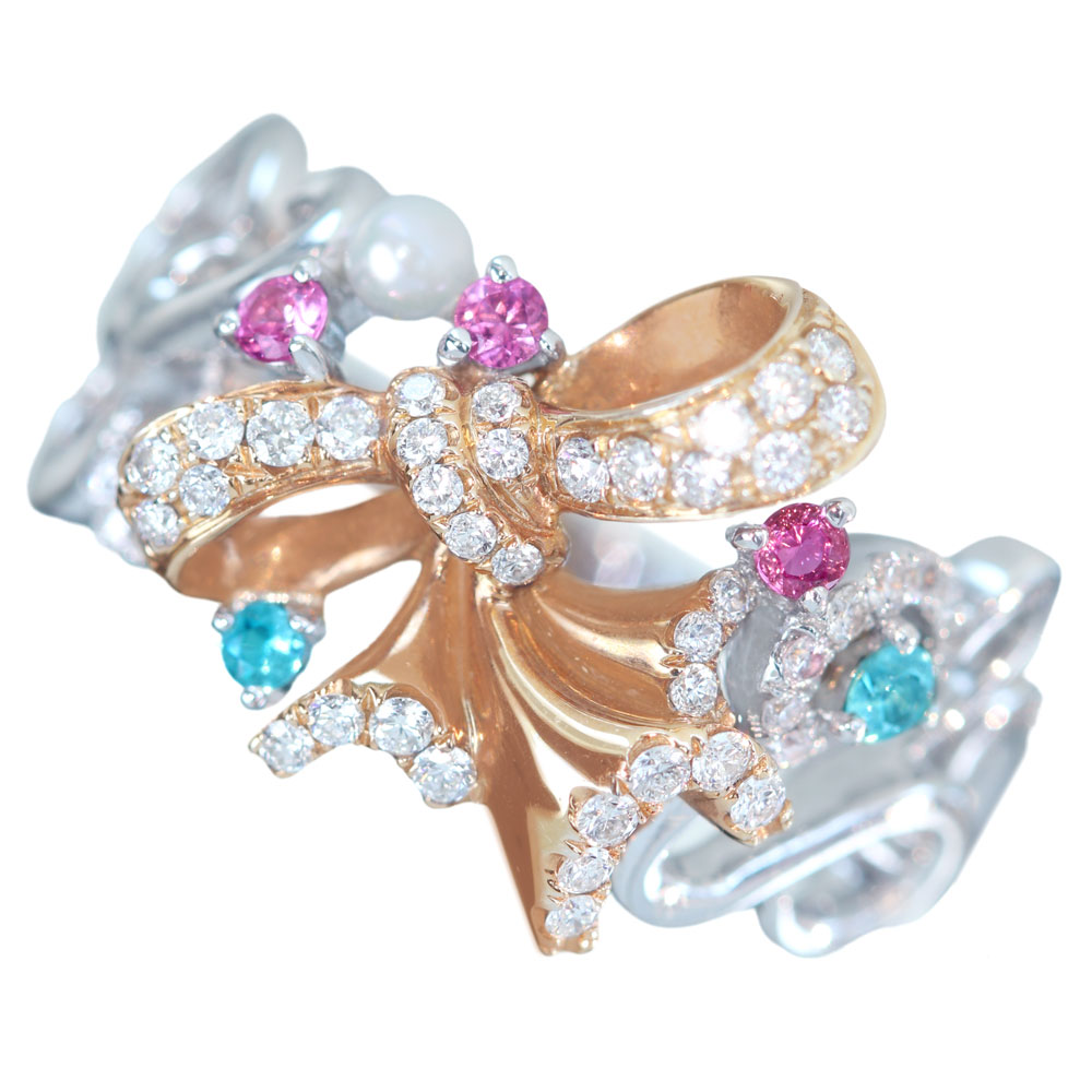 【代行販売】K18WG/PG ダイヤモンド パライバトルマリン ピンクサファイア パール リング フルオーダー リボンモチーフ