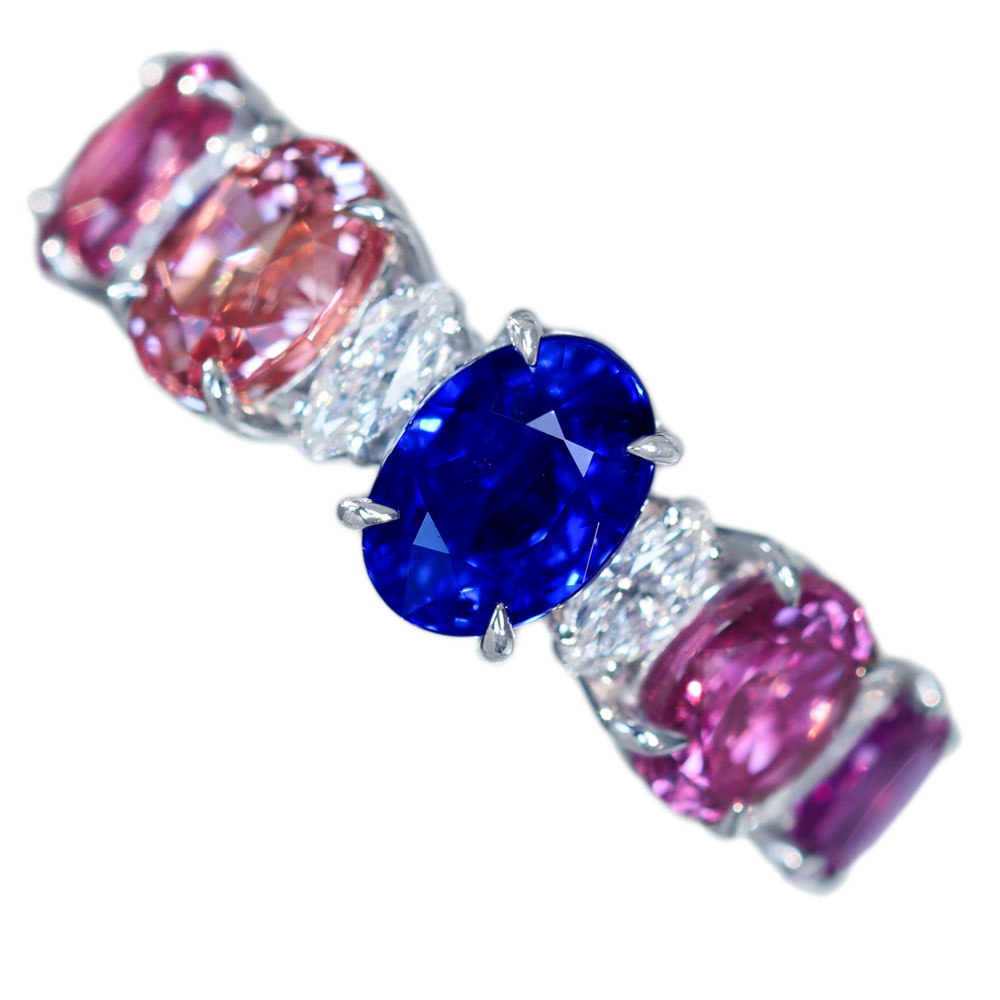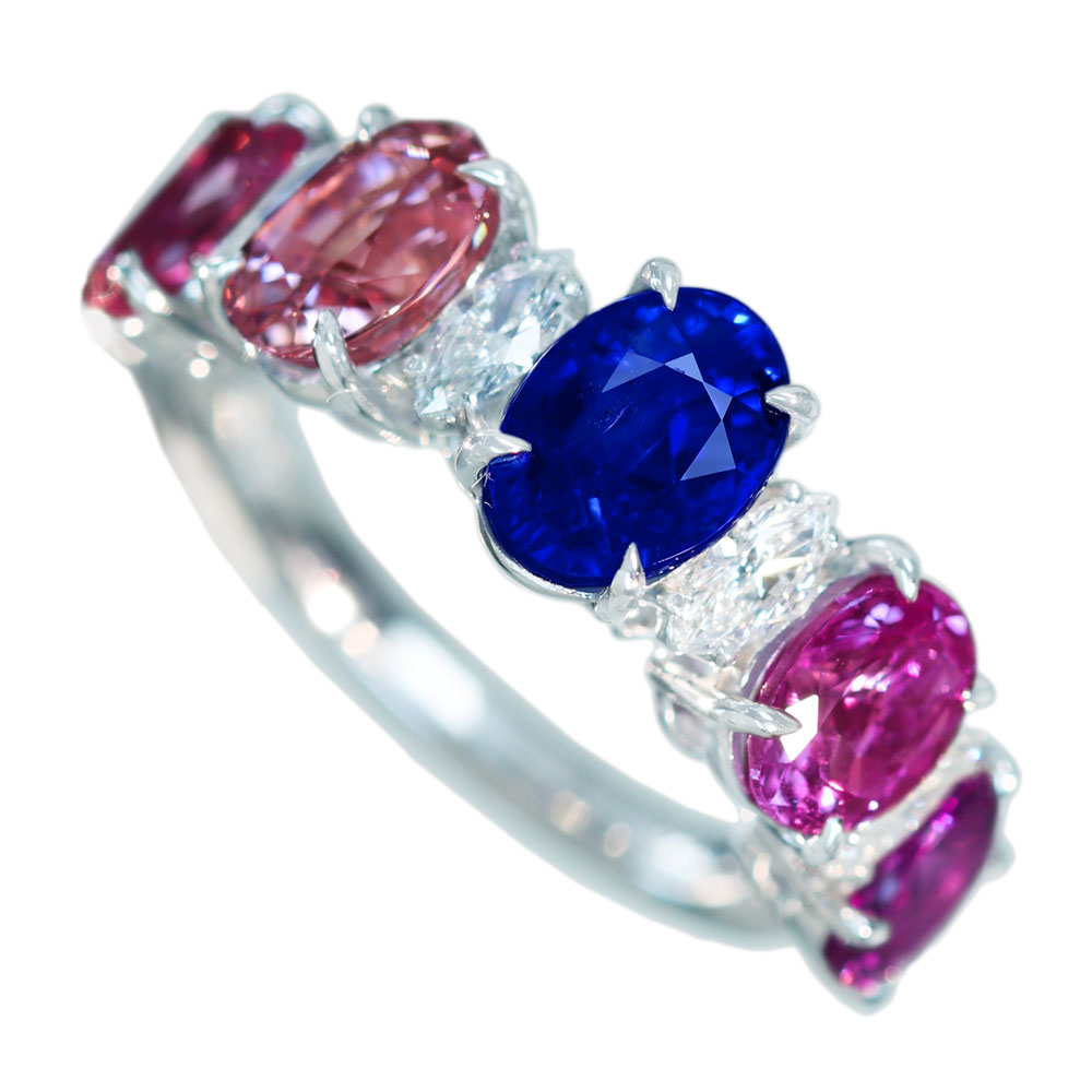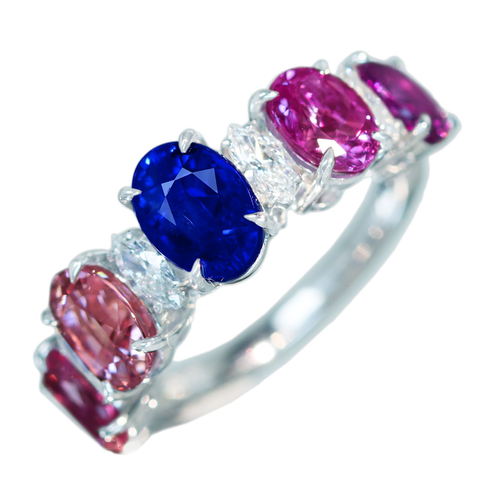 《100年引き継がれるジュエリーを- ハンドメイドジュエリー展》【HANDMADE】PT950 非加熱スリランカ産ブルーサファイア 2.30ct 非加熱ピンクサファイア 0.92ct/1.18ct/0.79ct 非加熱パープルサファイア 0.73ct ダイヤモンド total 0.408ct エタニティリング[GIA]