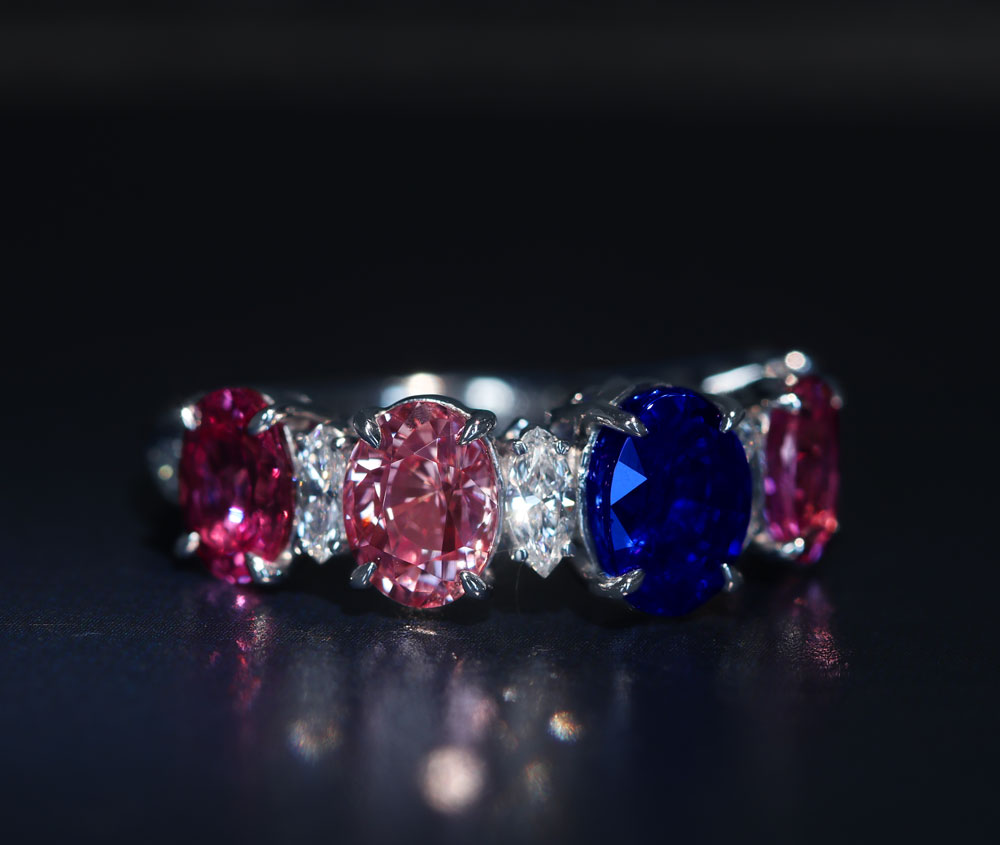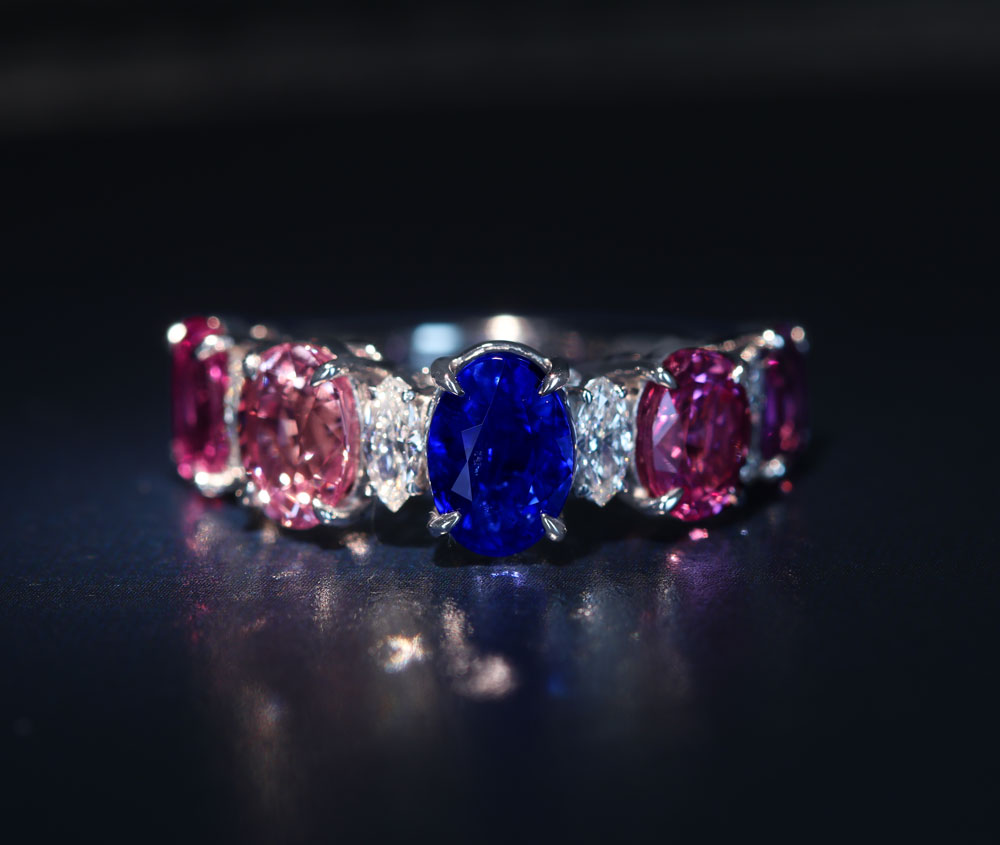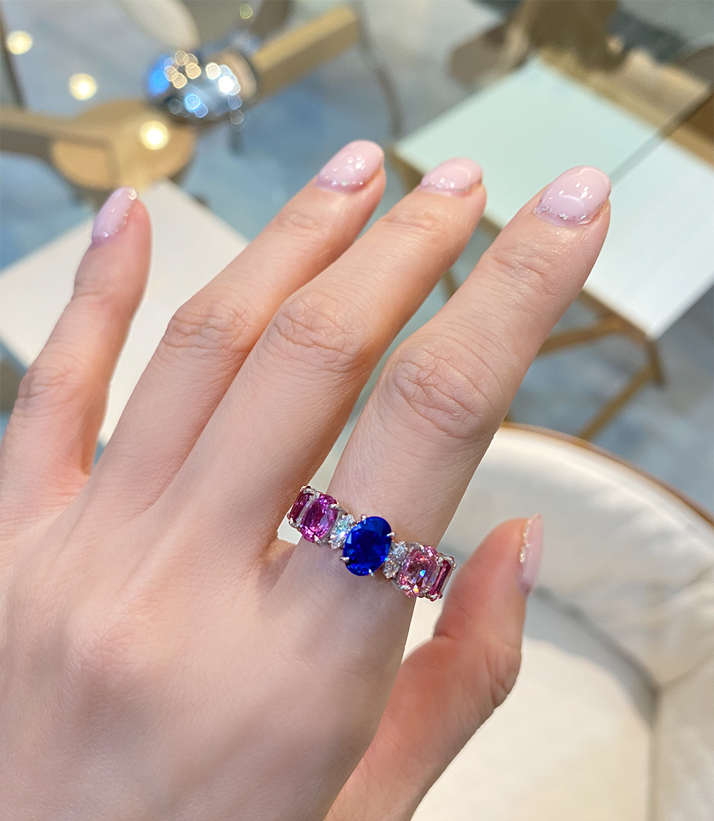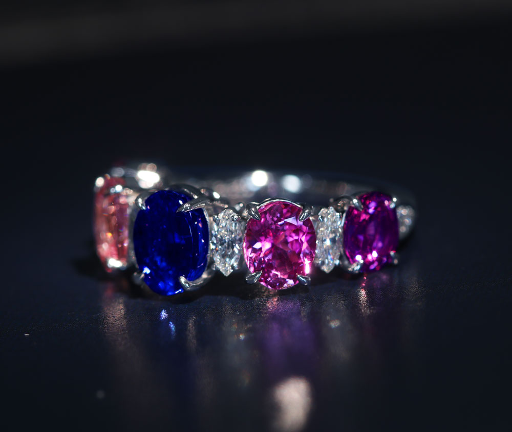 《100年引き継がれるジュエリーを- ハンドメイドジュエリー展》【HANDMADE】PT950 非加熱スリランカ産ブルーサファイア 2.30ct 非加熱ピンクサファイア 0.92ct/1.18ct/0.79ct 非加熱パープルサファイア 0.73ct ダイヤモンド total 0.408ct エタニティリング[GIA]
