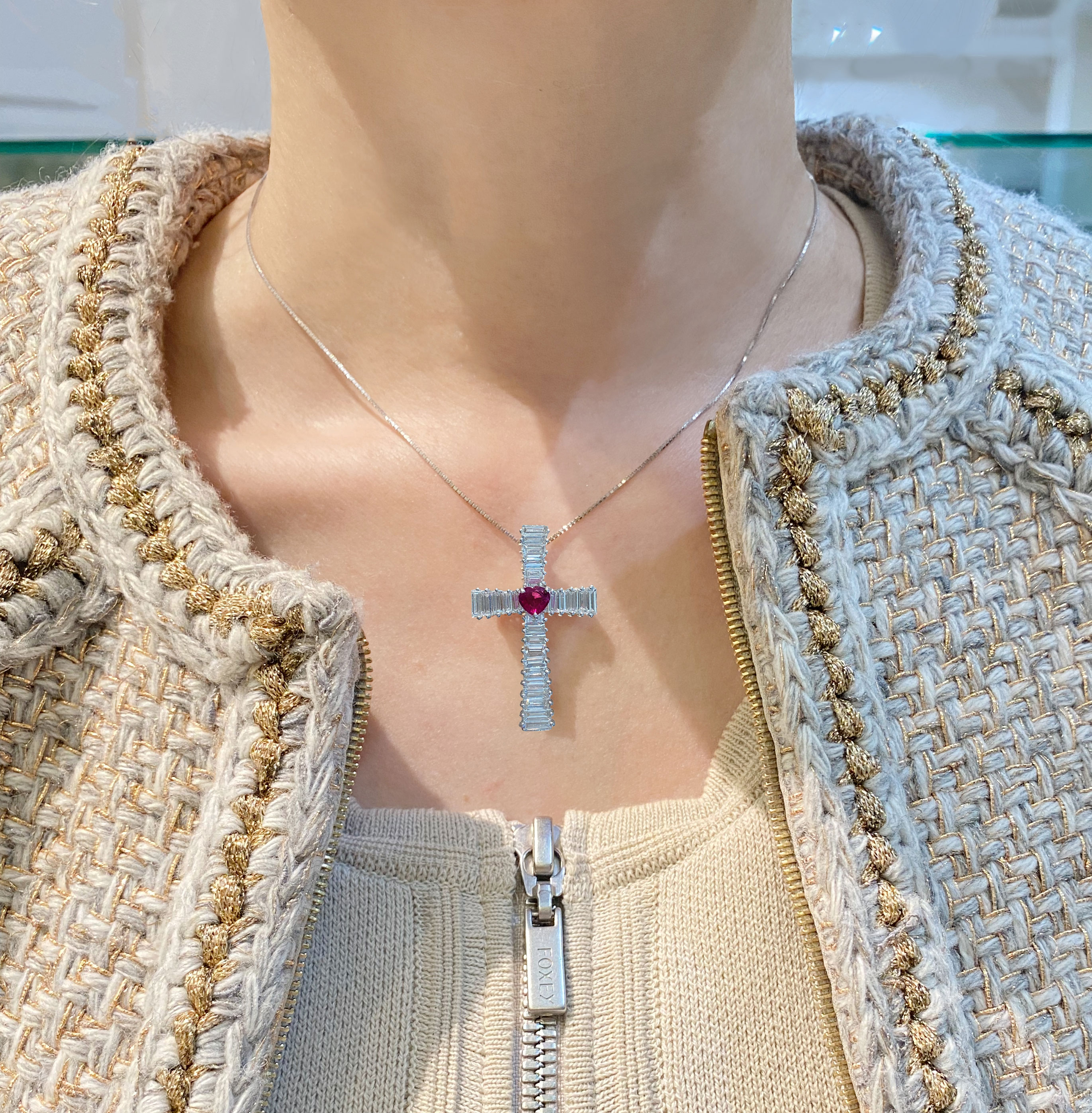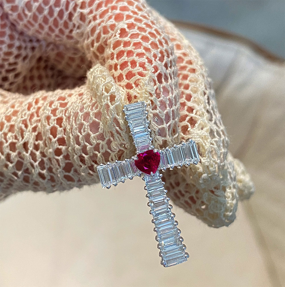 K18WG ルビー 0.39ct ハートシェイプ ダイヤモンド 1.3ct バゲットカット クロスペンダントトップ