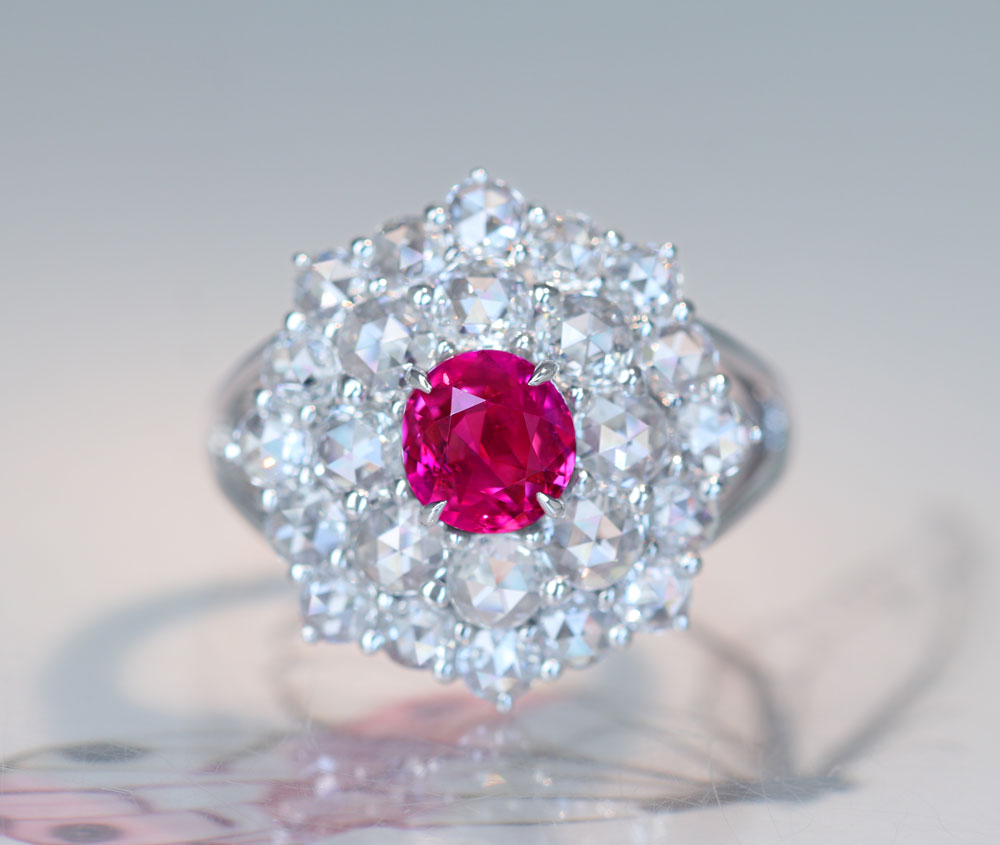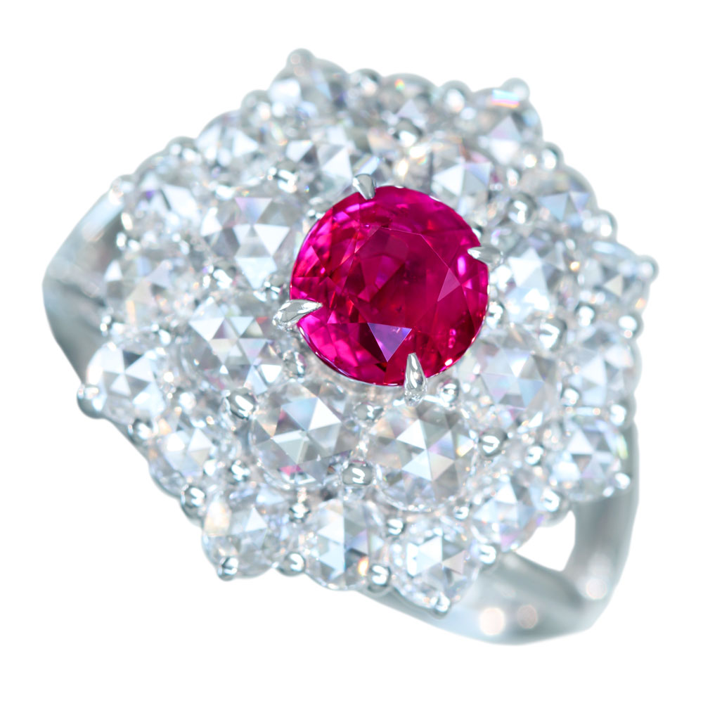 《100年引き継がれるジュエリーを- ハンドメイドジュエリー展》【HANDMADE】PT950 ビルマ産非加熱ピンクサファイア 1.24ct ローズカットダイヤモンド 1.736ct リング[GIA]