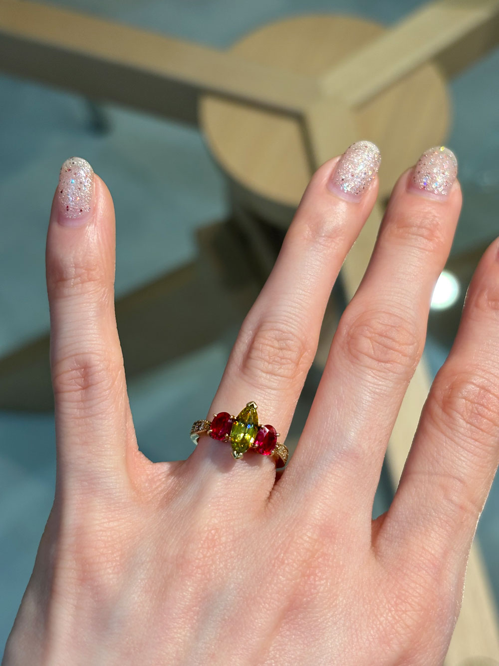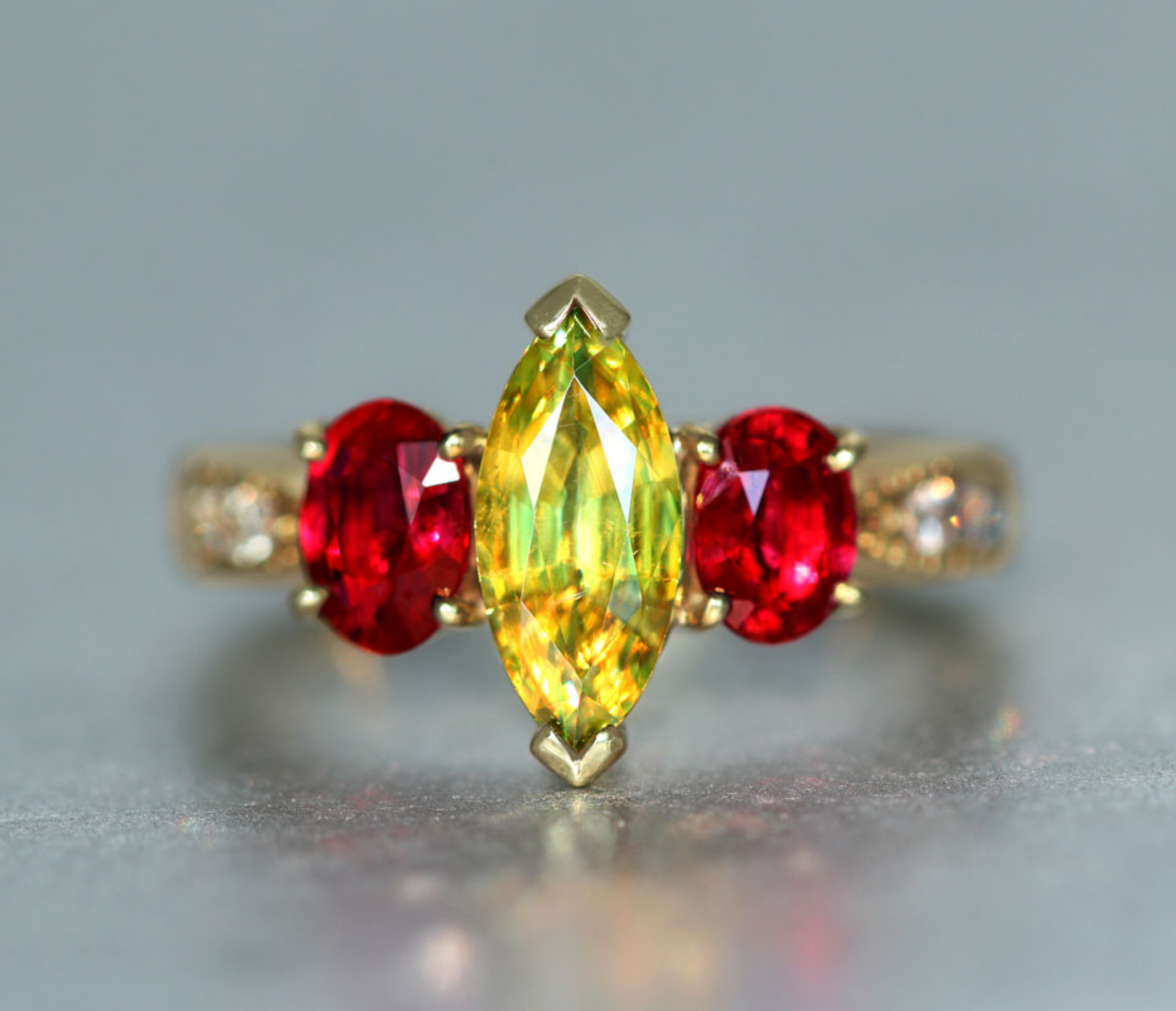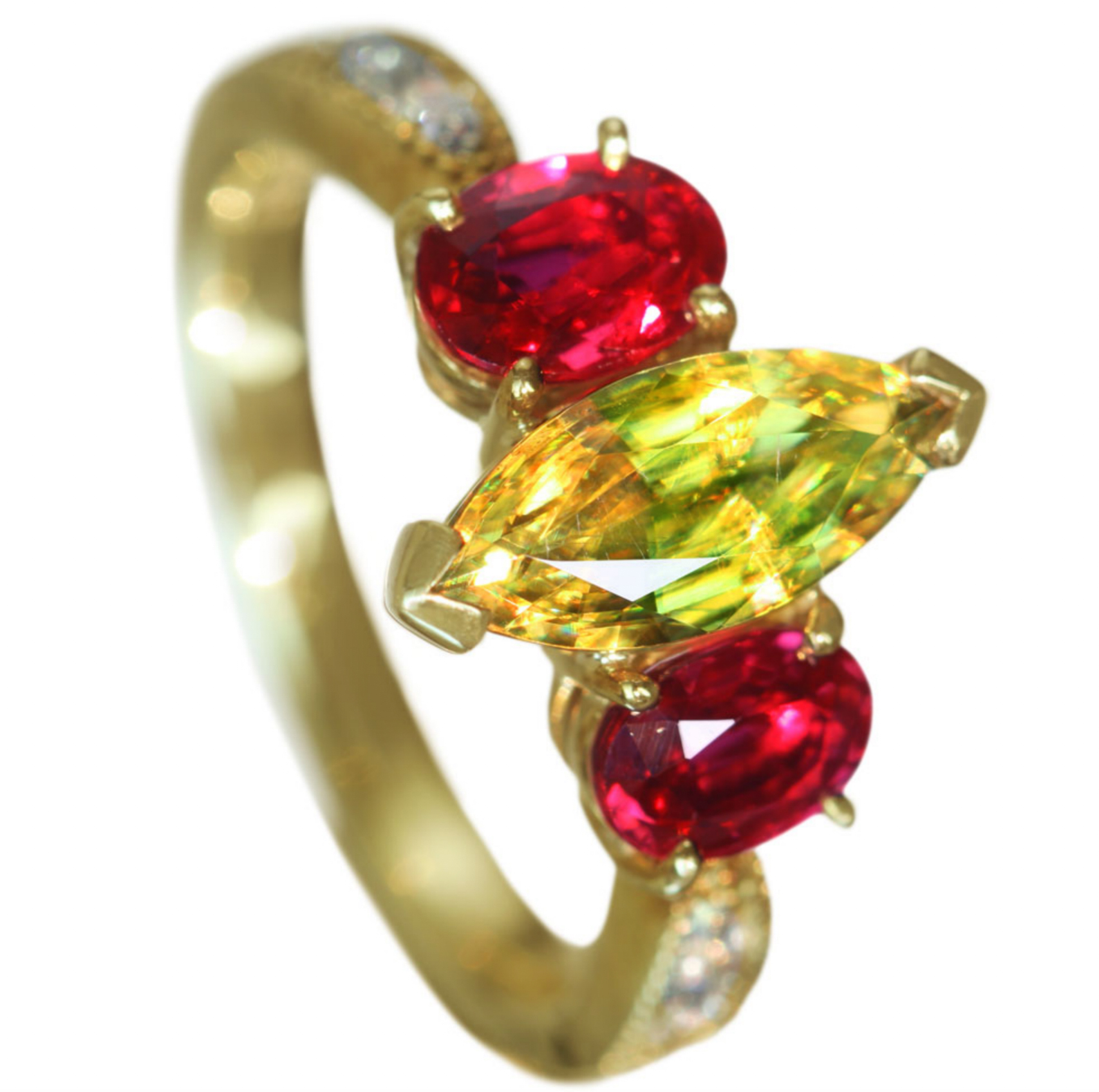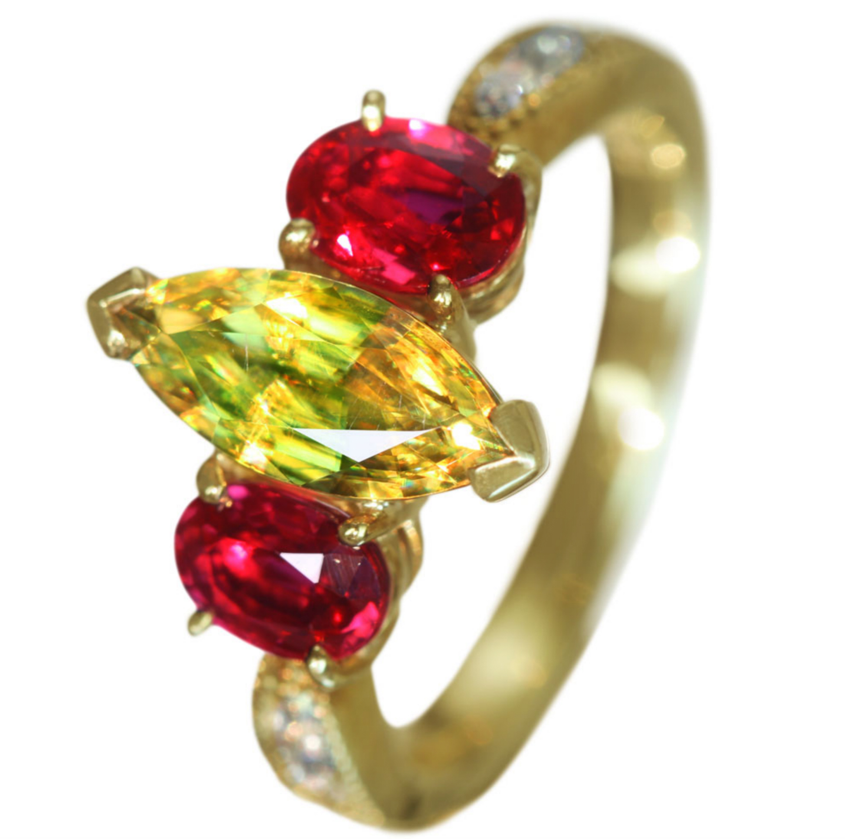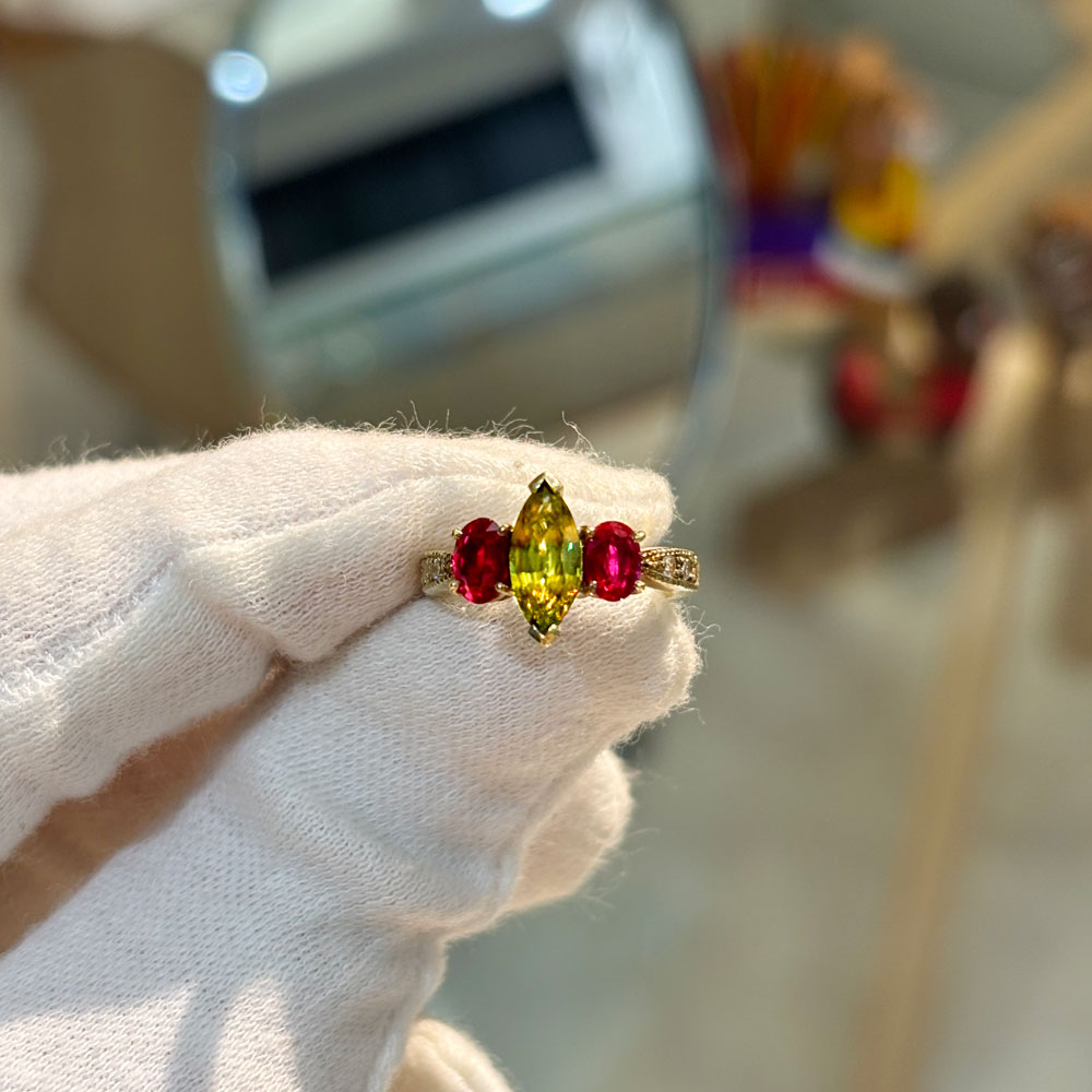 スフェーンとルビーを脇石にあしらったユニークなアイコンリング。