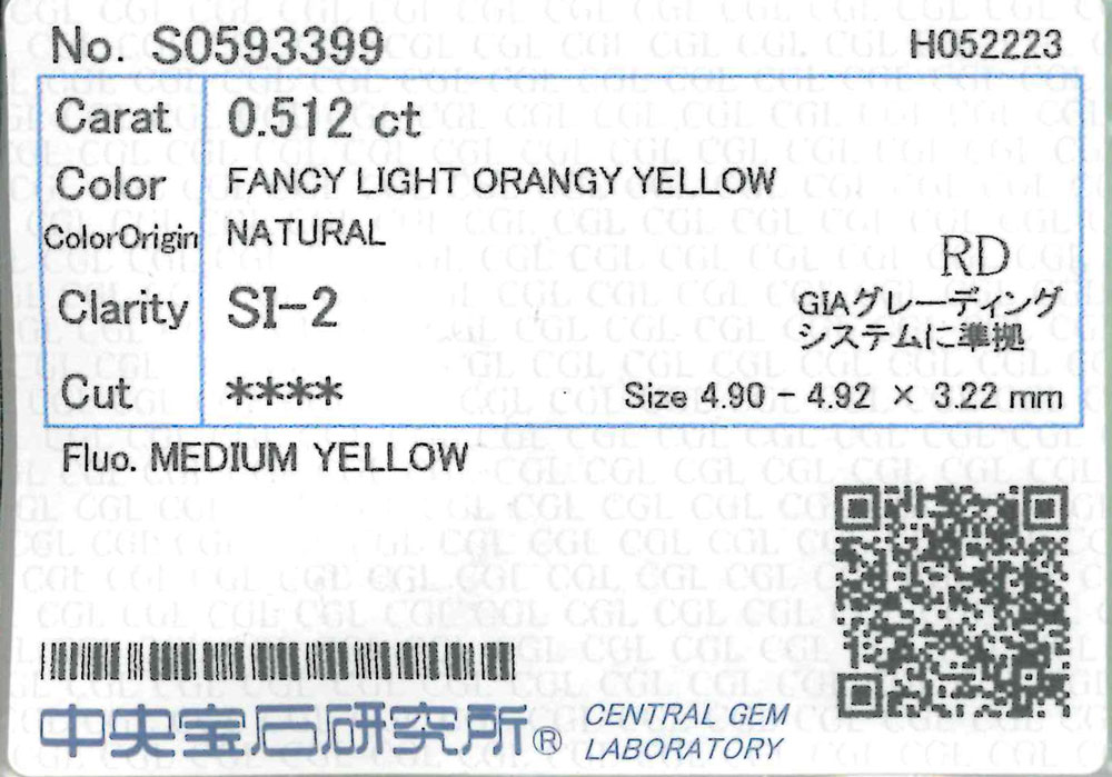 《DIAMOND MARKET》イエローダイヤモンド FANCY LIGHT ORANGY YELLOW SI-2 0.512ct ルース ラウンドブリリアント[中央宝石研究所]