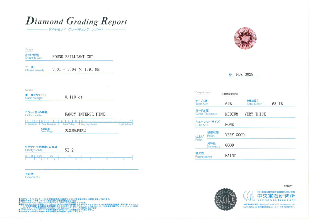 【代行販売】ピンクダイヤモンド FANCY INTENSE PINK SI-2 0.110ct ルース[中央宝石研究所]