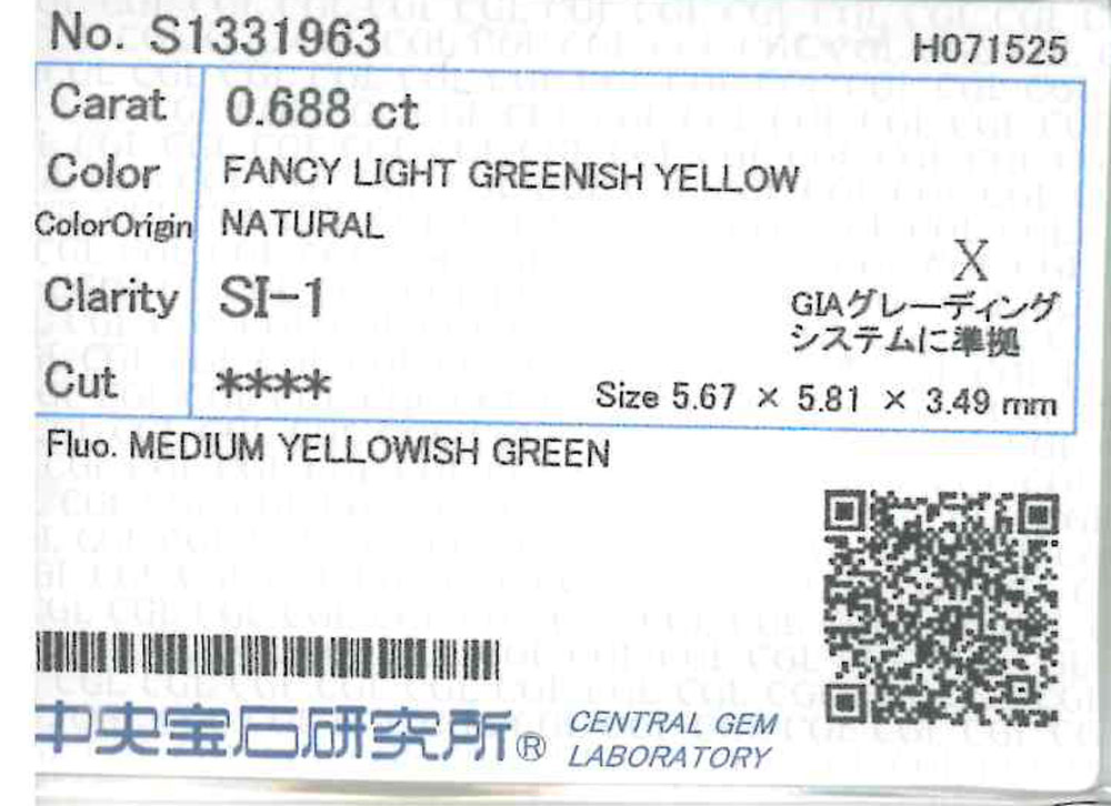 STAR イエローダイヤモンド 0.688ct FANCY LIGHT GREENISH YELLOW SI1 ルース スター[中央宝石研究所]