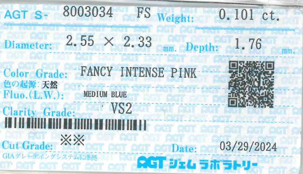【代行販売】ピンクダイヤモンド 0.101ct FANCY INTENSE PINK VS2 ルース クッションカット[AGT]