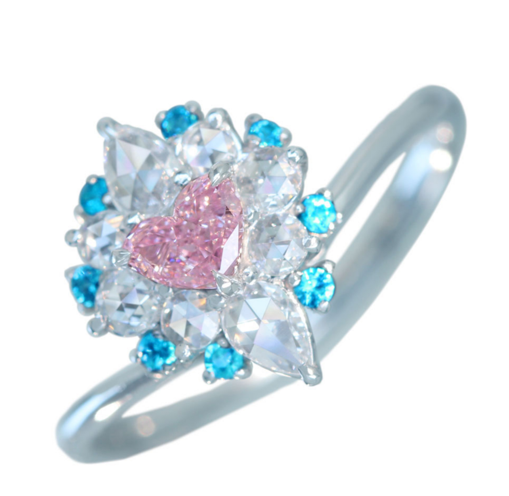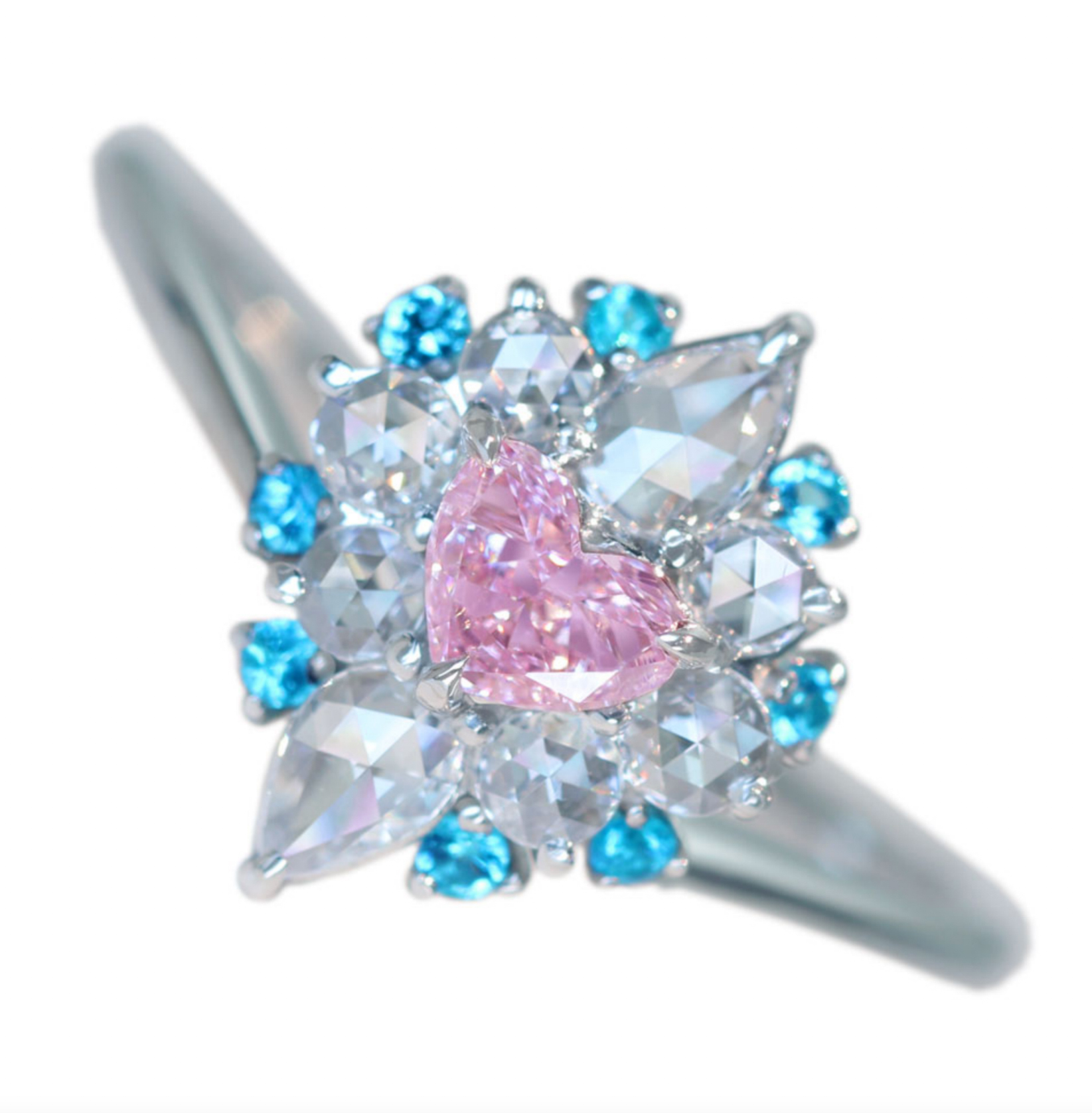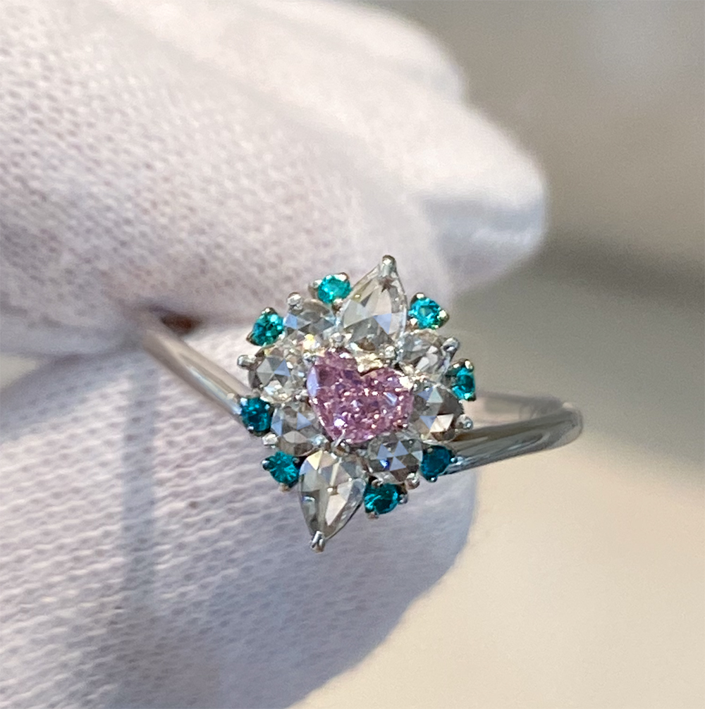 《100年引き継がれるジュエリーを- ハンドメイドジュエリー展》【HANDMADE】PT950 ピンクダイヤモンド FANCY LIGHT PURPLISH PINK 0.132ct ローズカットダイヤモンド total0.251ct パライバトルマリン total0.062ct リング[中央宝石研究所]