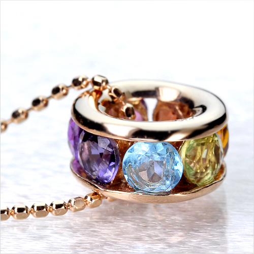 柔らかな輝きと角の丸みが女性らしく色とりどりのストーンがお肌の上でよく映えます。